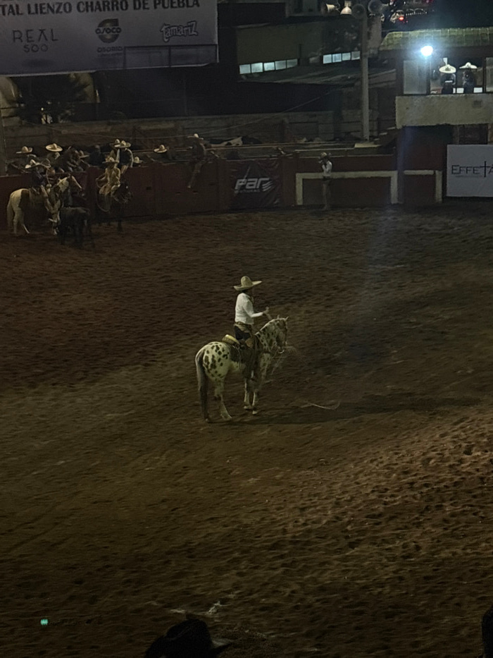 A person wearing a cowboy hat rides a spotted bull in a dirt arena. There is a crowd of people watching. The arena has walls with advertising signs. The lighting is dim, and some objects are difficult…read more