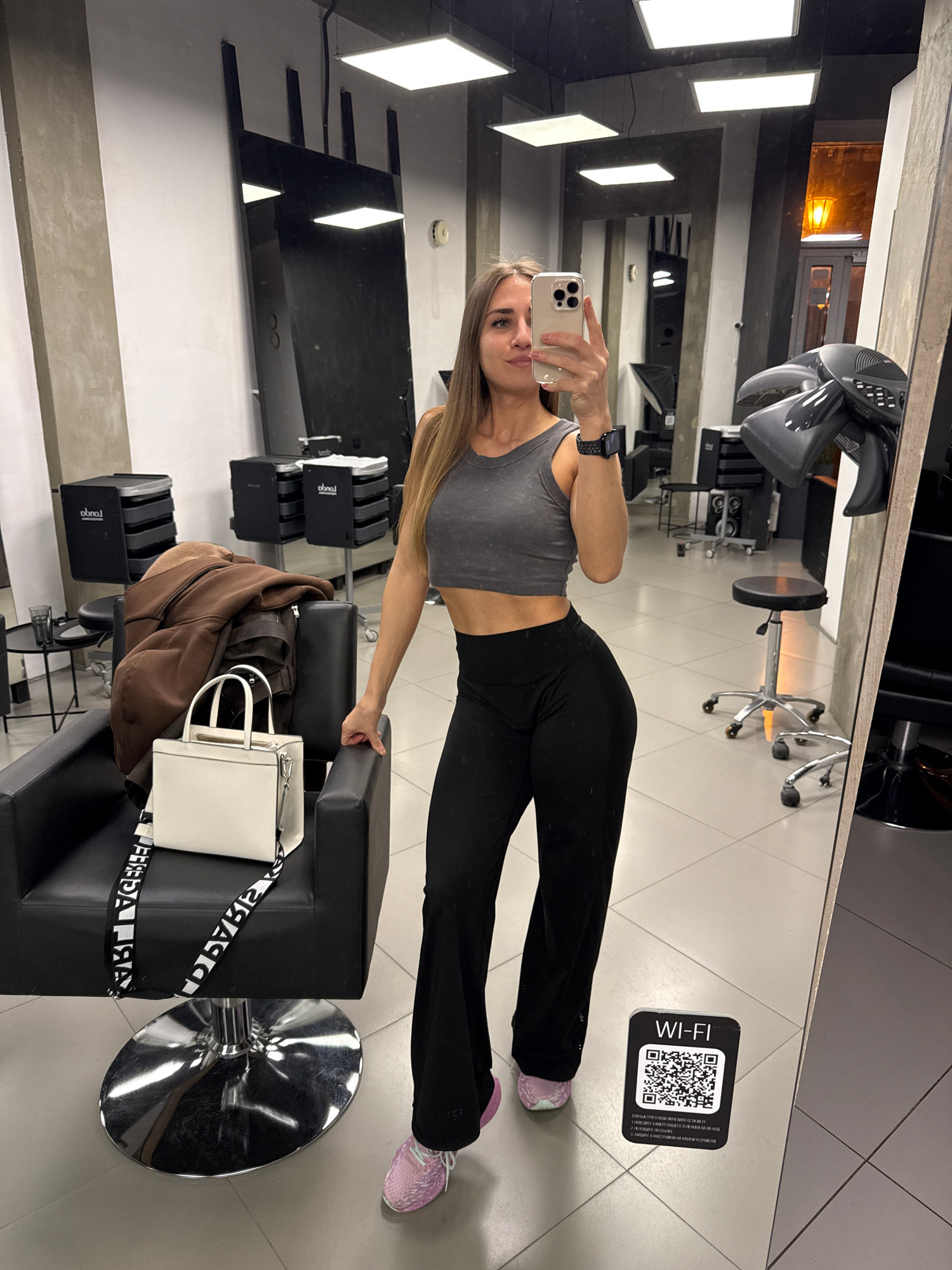 A woman takes a mirror selfie in what appears to be a salon. She wears a gray tank top and black pants. Her blonde hair is long. She holds a white smartphone in her left hand and wears a watch on her…read more