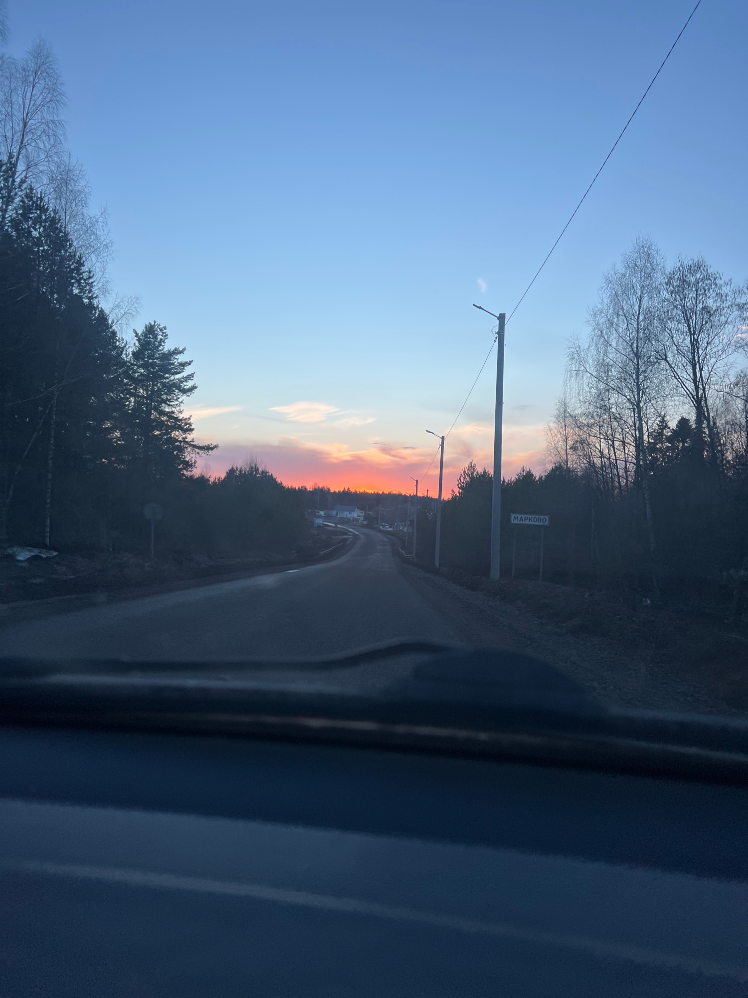 The image shows a road leading into Markovskii, Russia, indicated by a road sign. The view is likely from inside a vehicle. The sky displays colors of sunset or sunrise. Power lines run along the road…read more