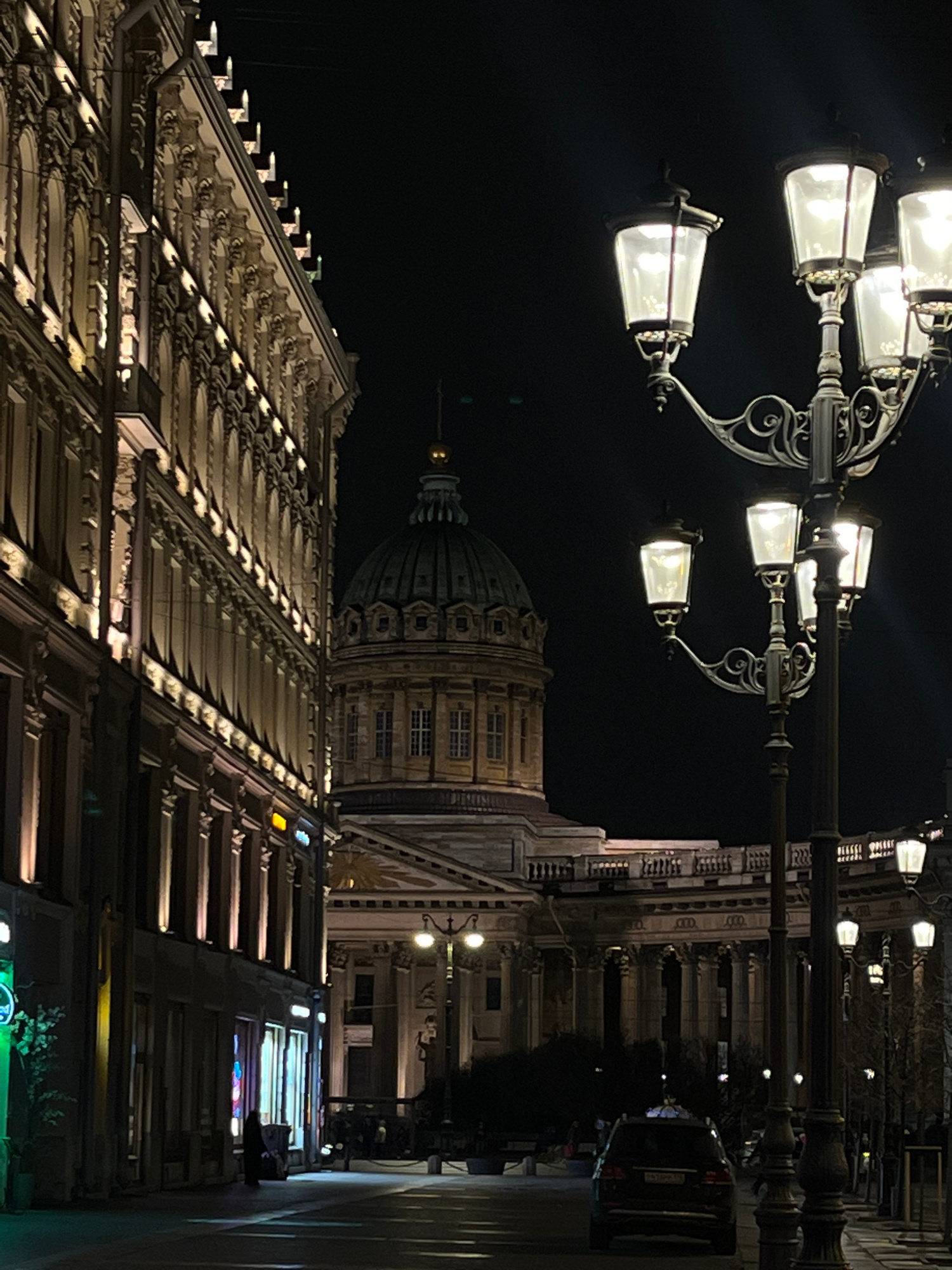 The image shows a nighttime view of Saint Petersburg, Russia. The scene is illuminated by ornate street lamps, which dominate the upper left of the frame. A prominent architectural structure with a do…read more