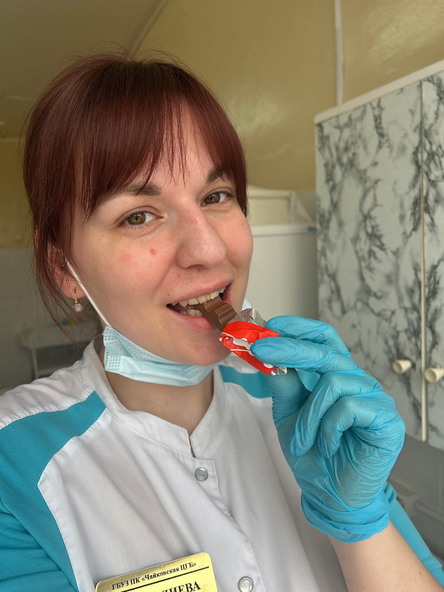 A mid-shot captures a person, likely a woman with reddish-brown hair and brown eyes, looking directly at the camera with a playful expression. She is wearing a white medical coat with light blue accen…read more