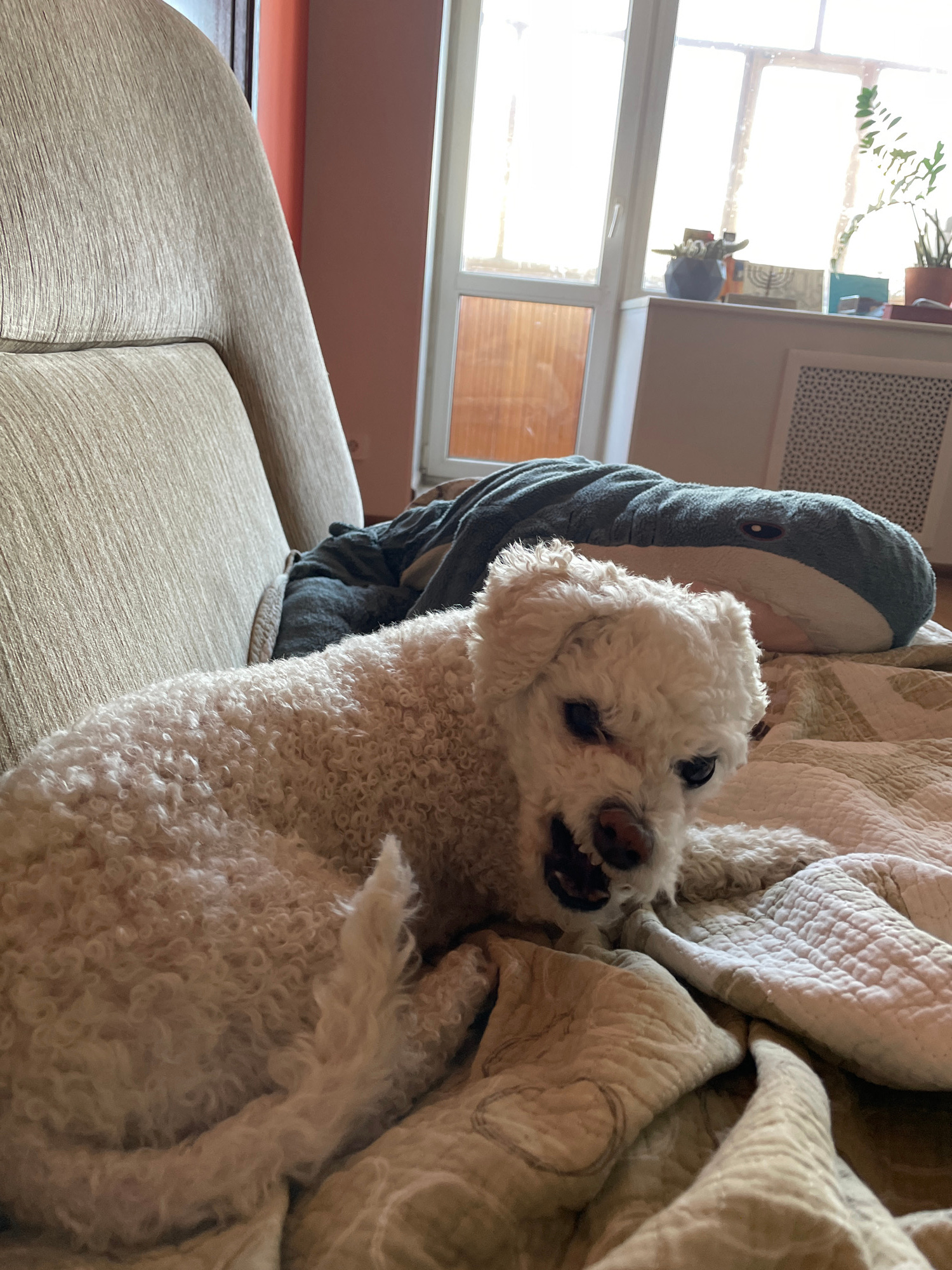 A small, white, curly-haired dog is lying on a beige couch next to a gray shark plush toy. The dog is positioned towards the viewer, with its head tilted and its teeth slightly bared. A patterned beig…read more