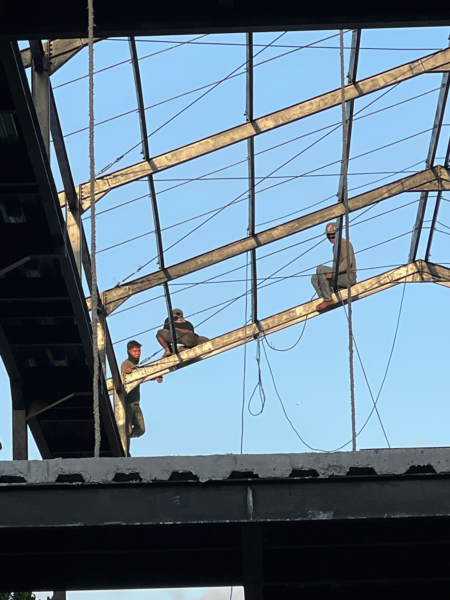 Three workers are perched on the steel framework of a building under construction in Ubud District, Indonesia. The framework consists of a pattern of intersecting beams against a clear blue sky. The w…read more