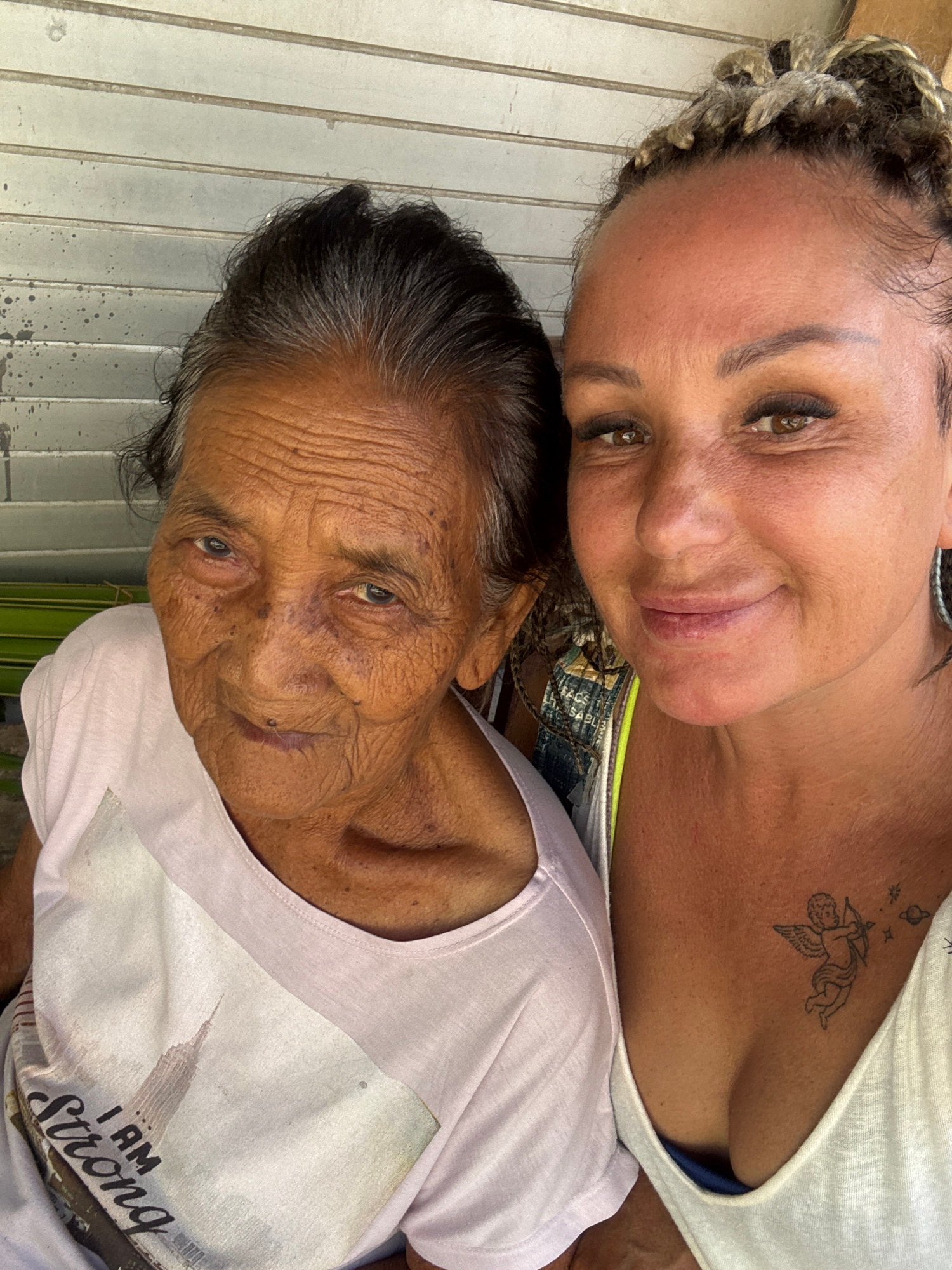 Two women are closely positioned, facing the camera. The woman in the upper position appears younger, with light skin, braided hair, and a tattoo of an angel with a bow and arrow on her upper chest. S…read more