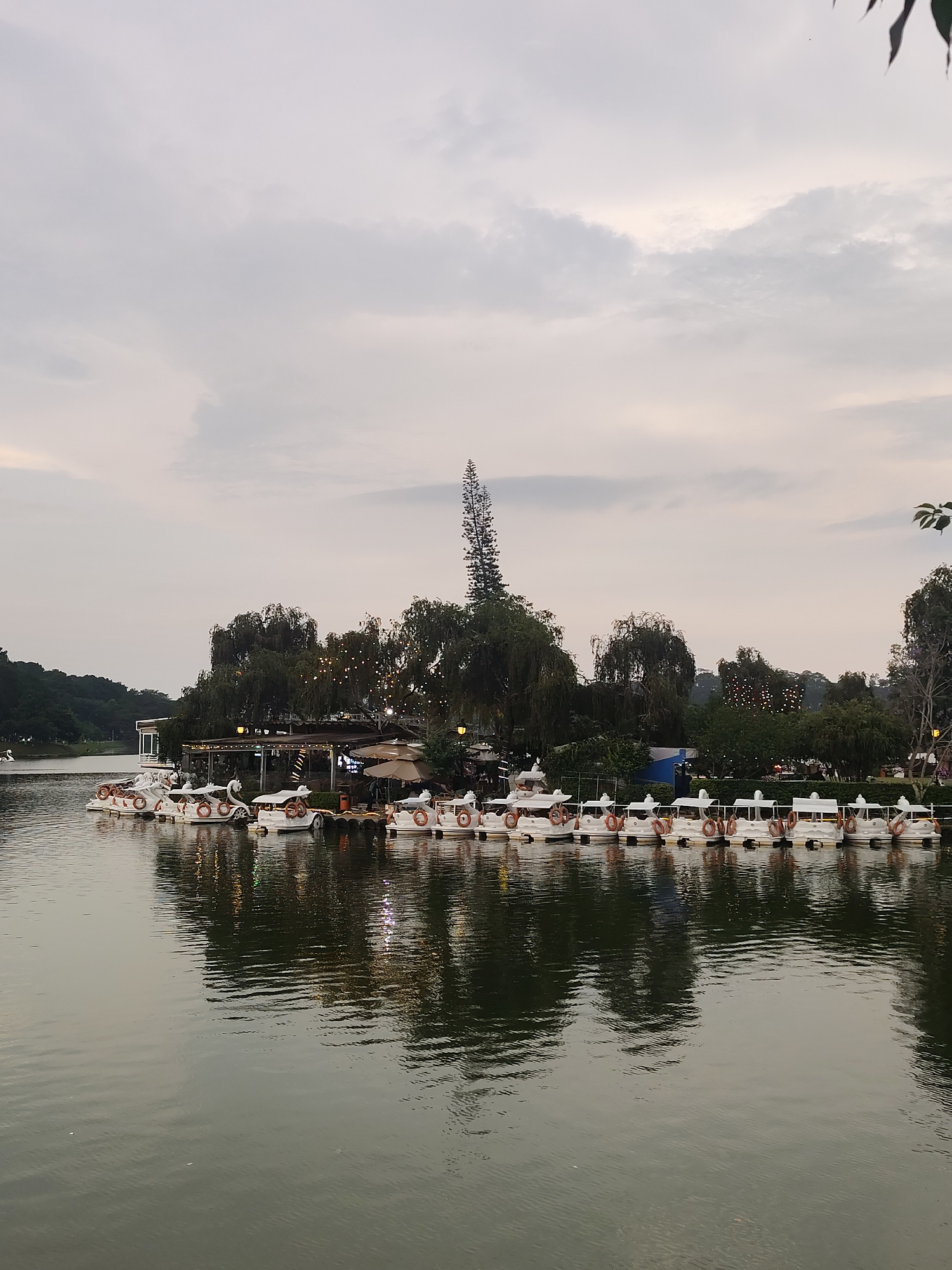 This image depicts a serene lakeside scene at Xuan Huong Lake in Da Lat, Vietnam, likely captured during late afternoon or early evening under an overcast sky. A long line of white paddle boats, many…read more