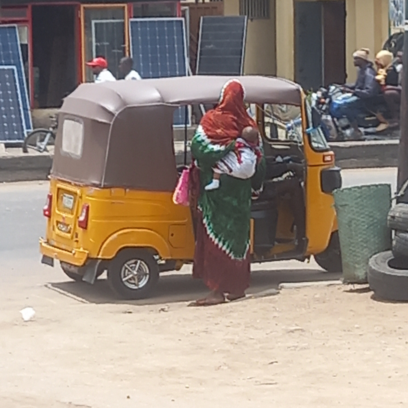 The image, correctly oriented, captures a daytime street scene in Dadi Riba, Nigeria. A yellow auto-rickshaw, locally known as a "keke napep," is parked on a dusty, light-colored street. It has a brow…read more