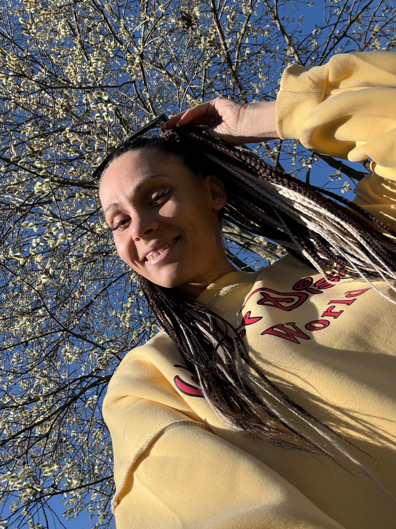 A woman with braided hair stands beneath a tree with emerging catkins against a bright blue sky. She wears a yellow sweatshirt with red lettering and holds her hand near her head, smiling slightly atβ¦read more