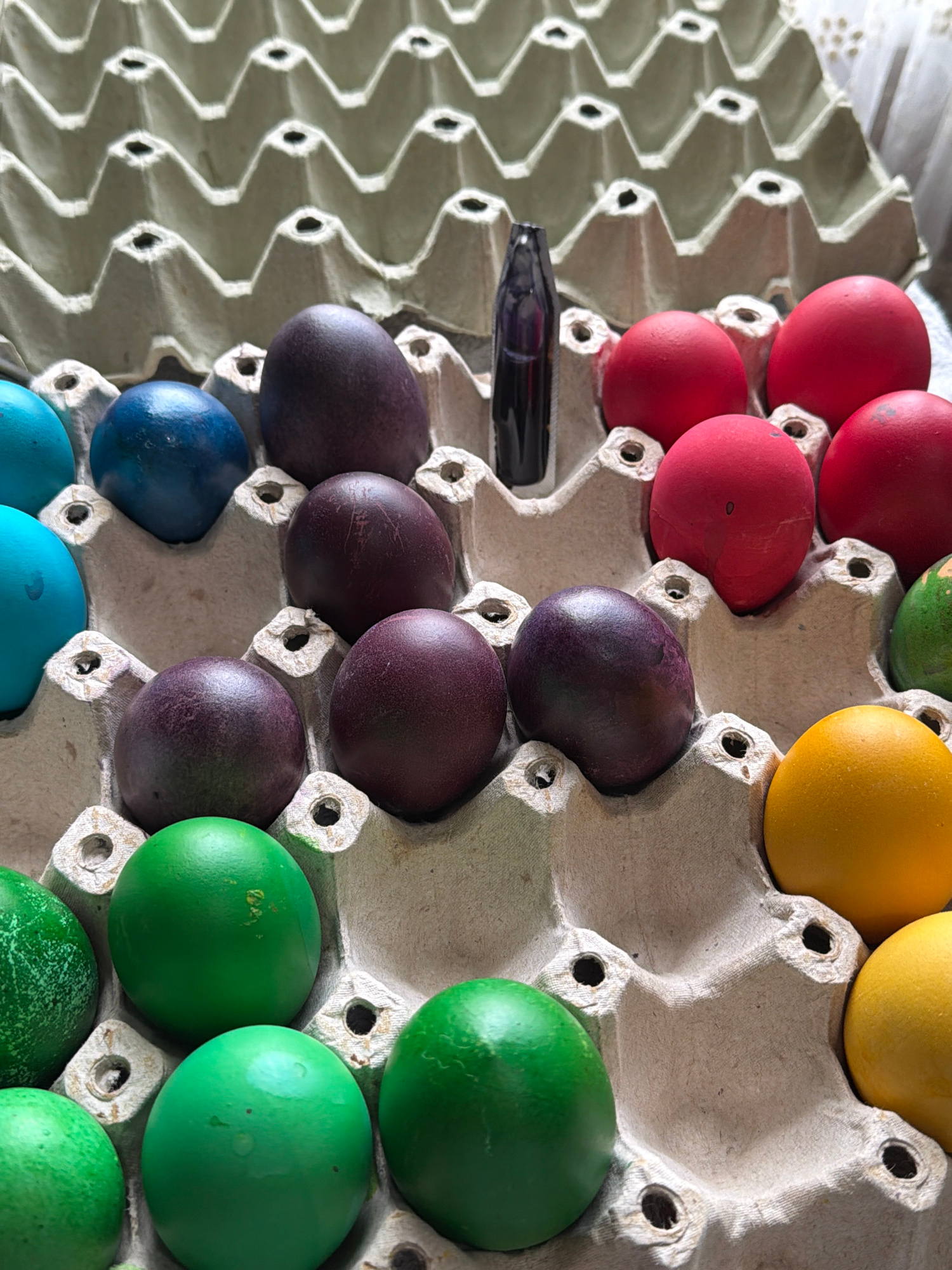 The image shows a close-up view of an egg carton filled with colorful, dyed eggs. The eggs are arranged in a rainbow-like gradient, transitioning from red, purple, blue, green, and yellow. The egg car…read more
