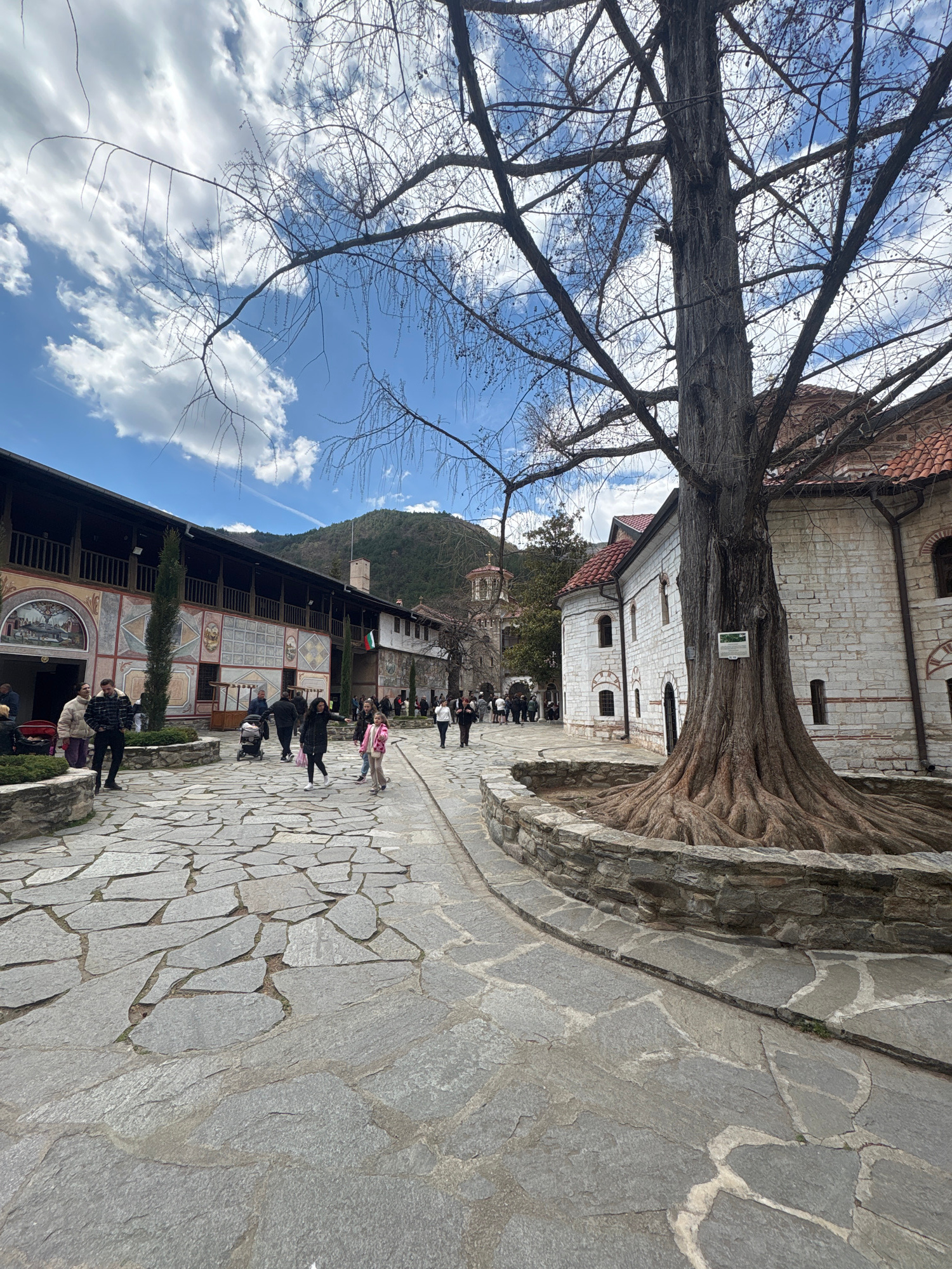 The image shows a courtyard in Bachkovo Monastery, Bachkovo, Bulgaria, with a large tree on the left side of the frame. The foreground consists of a stone path with irregular gray stones. A building w…read more
