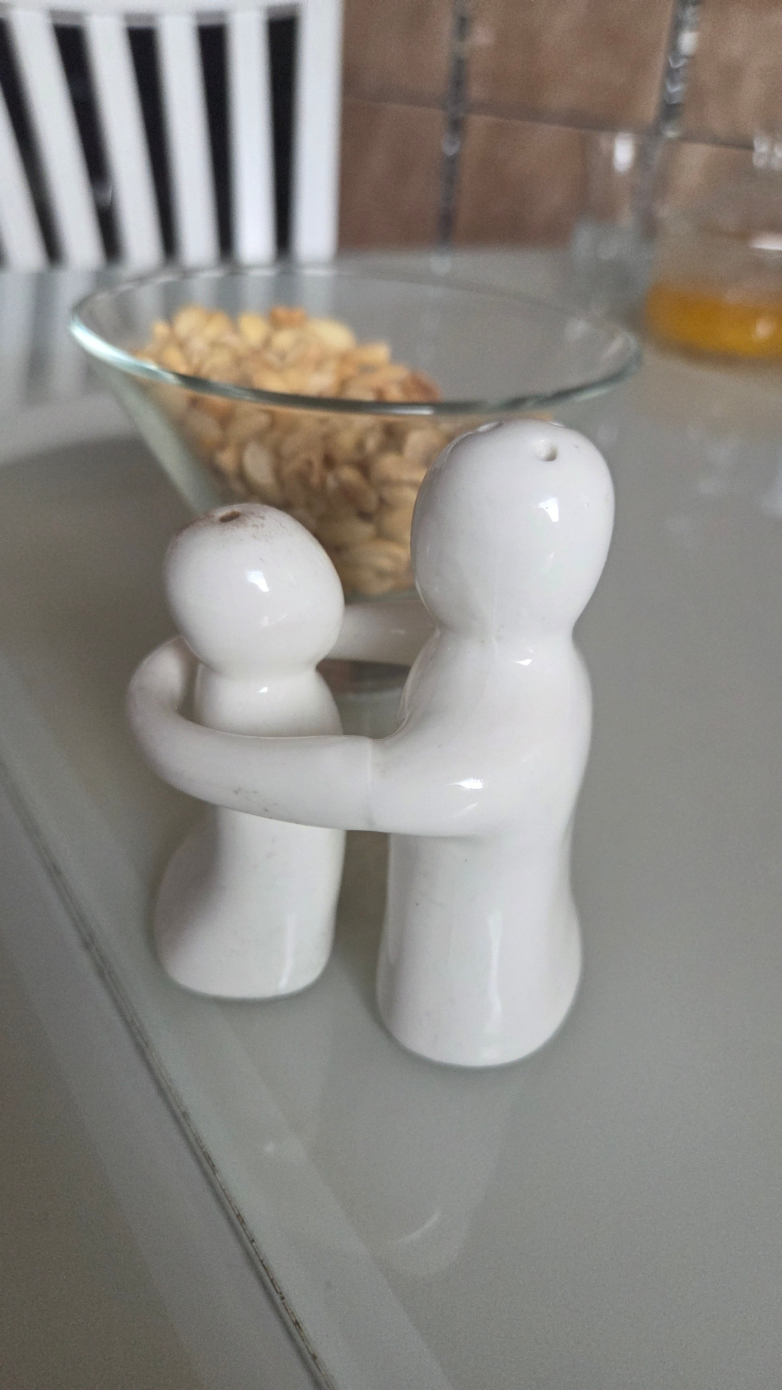 The image presents an indoor scene, likely a domestic setting such as a kitchen or dining area, in Chaikovsky, Russia. The central focus is two white ceramic figures, stylized to resemble human forms,…read more