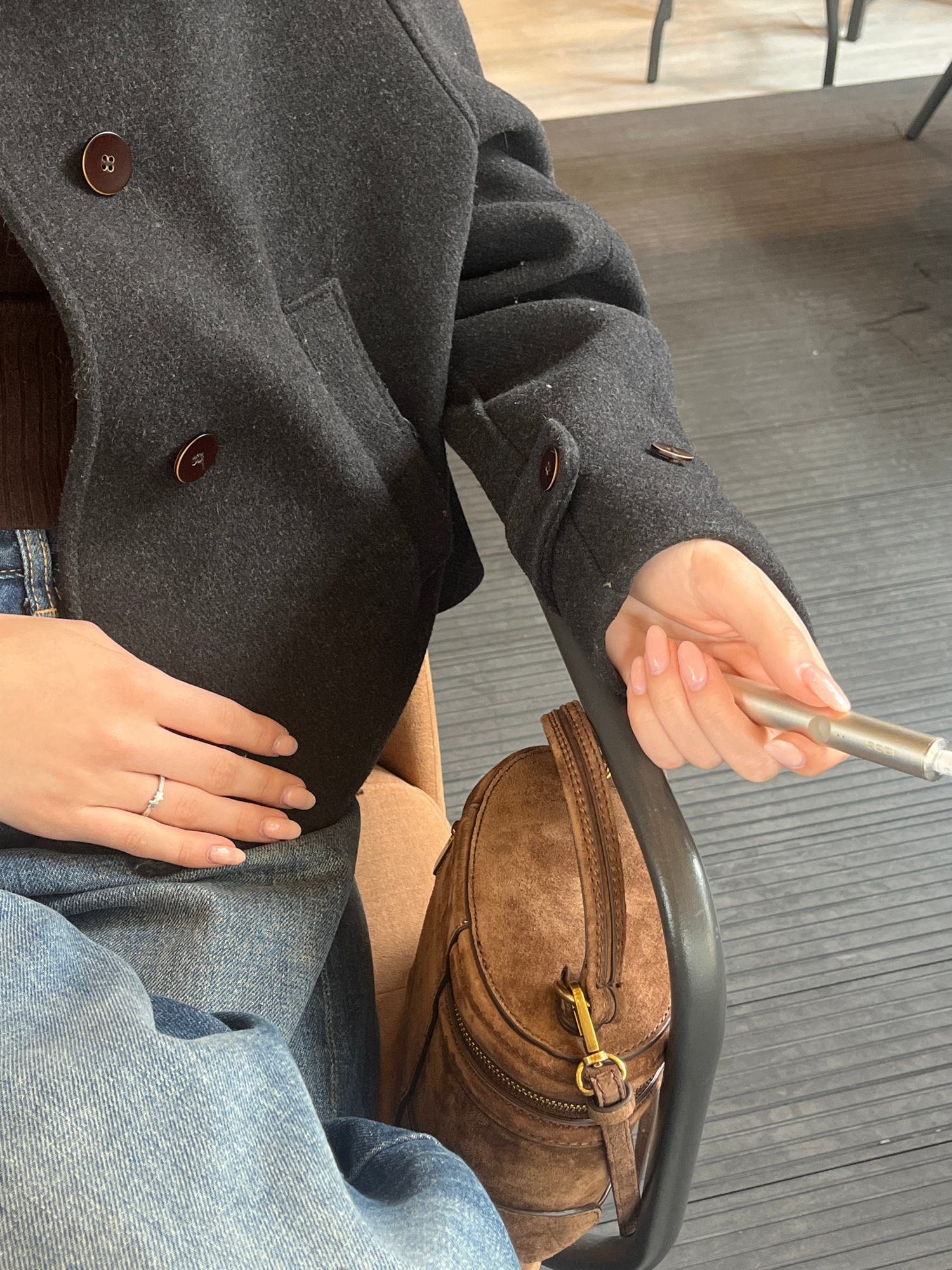 The image provides an overhead view of a person seated indoors in Plovdiv, Bulgaria, focusing on their torso, hands, and immediate belongings. The individual is wearing a dark gray wool-blend coat fea…read more