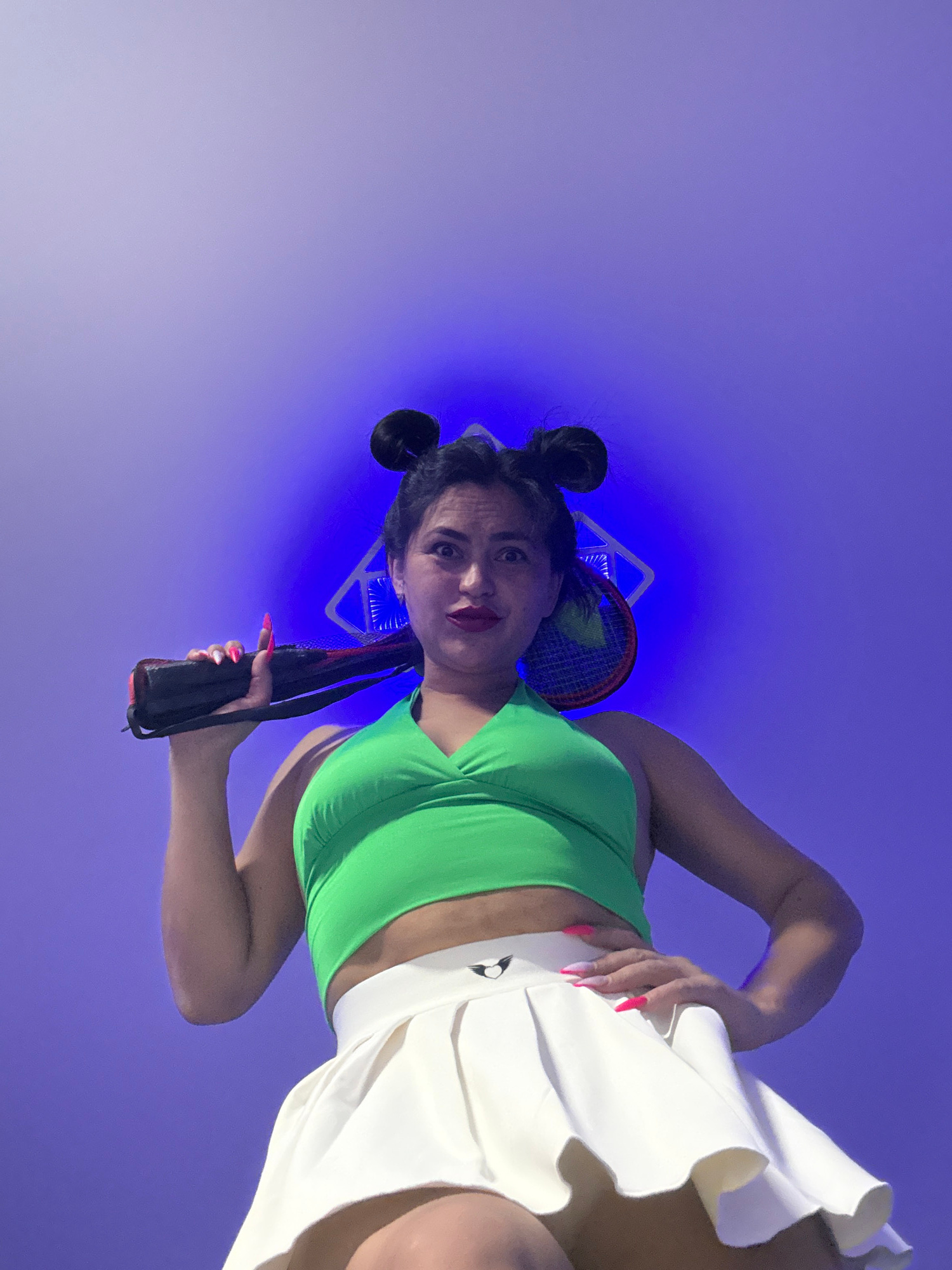 A woman is depicted in a full-body shot, rotated 90 degrees clockwise, creating an upward-looking perspective. She has dark hair styled in two prominent buns and wears a vibrant lime green crop top ex…read more