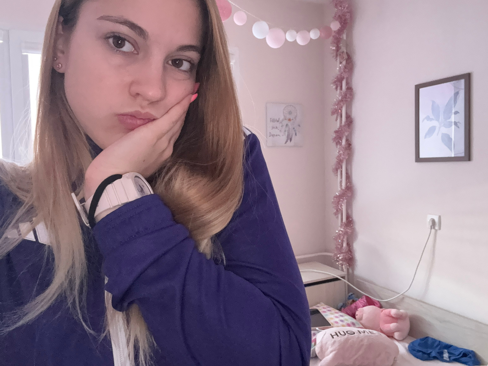 This image captures a medium close-up selfie of a young woman inside what appears to be a bedroom or personal living space in Sofia, Bulgaria. The woman is positioned on the left, looking directly at…read more