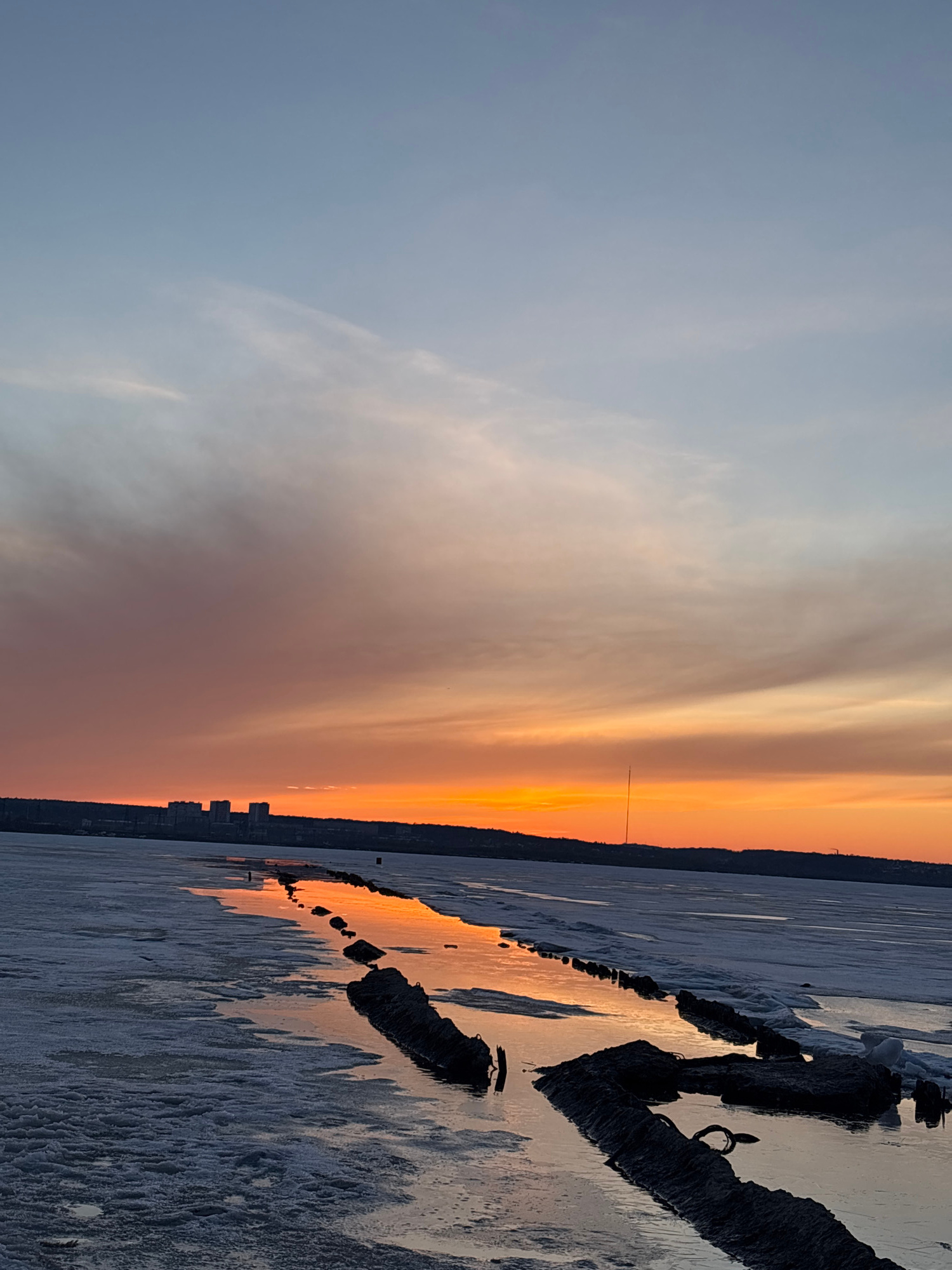 The image depicts a sunset over a frozen body of water, likely a section of the Izhevsk Pond in Izhevsk, Russia, during winter. The sky transitions from a light blue to orange and red hues near the ho…read more
