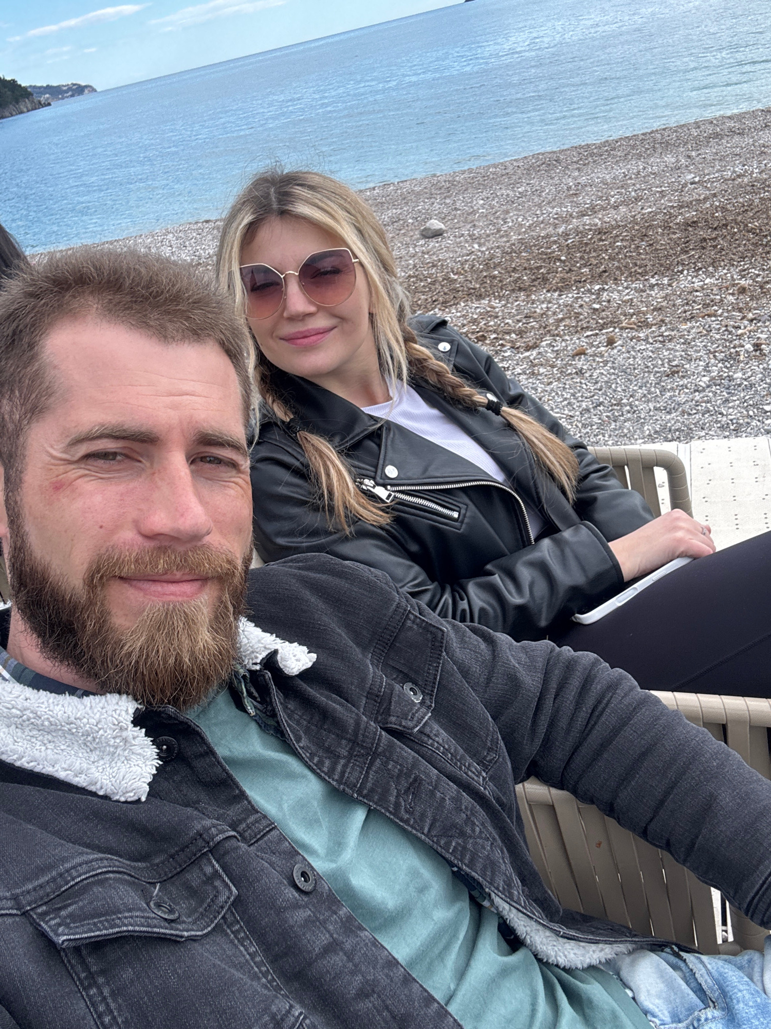 A selfie shot, rotated counterclockwise, shows a couple posing against a coastal backdrop. The man in the foreground has a full beard and wears a dark denim jacket with a white sherpa lining over a gr…read more