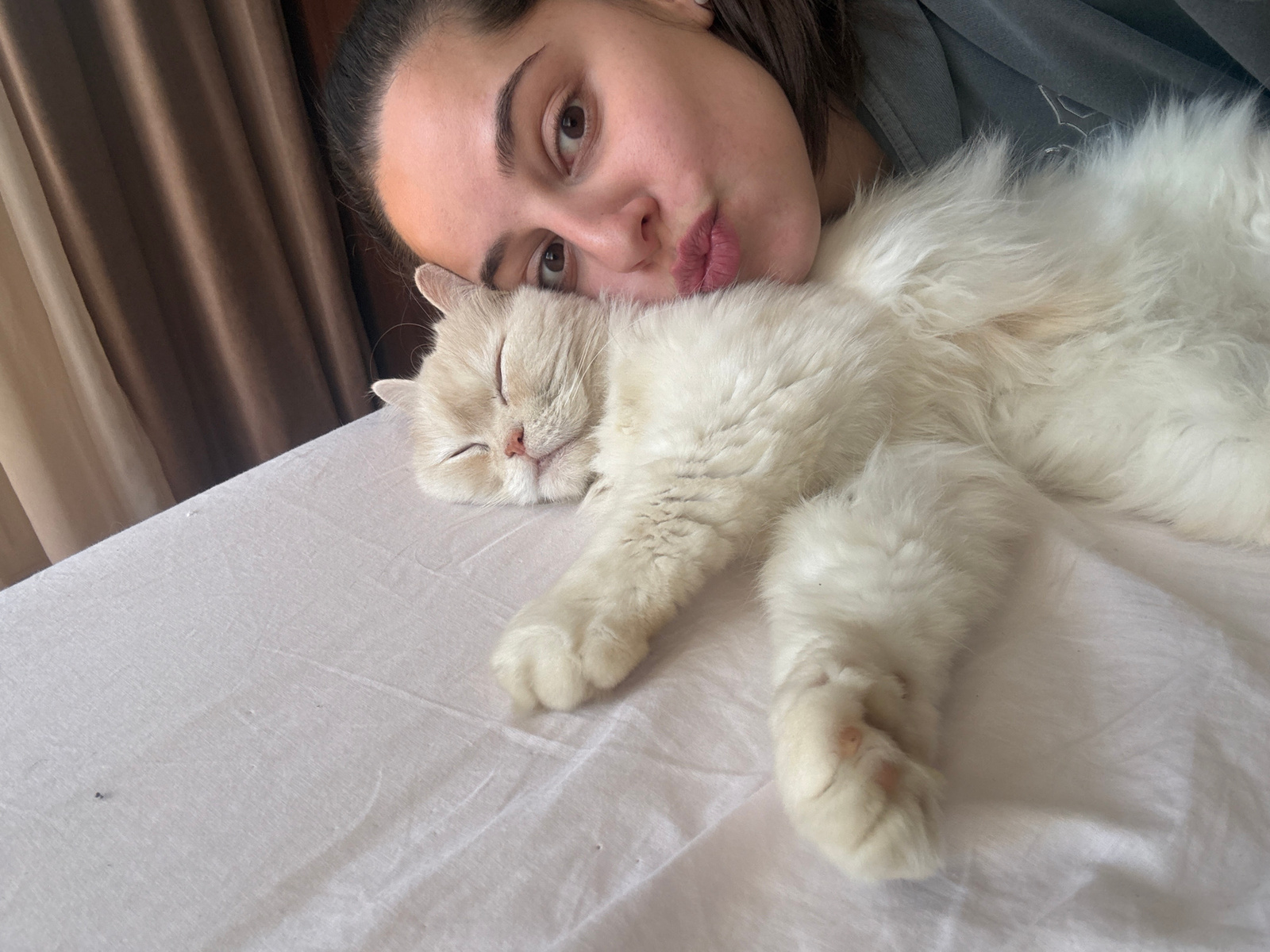 This close-up photograph captures a young woman and her fluffy, cream-colored cat resting intimately indoors, likely in a bedroom in Гледаци, Bulgaria. The woman, with dark hair and prominent eyebrows…read more