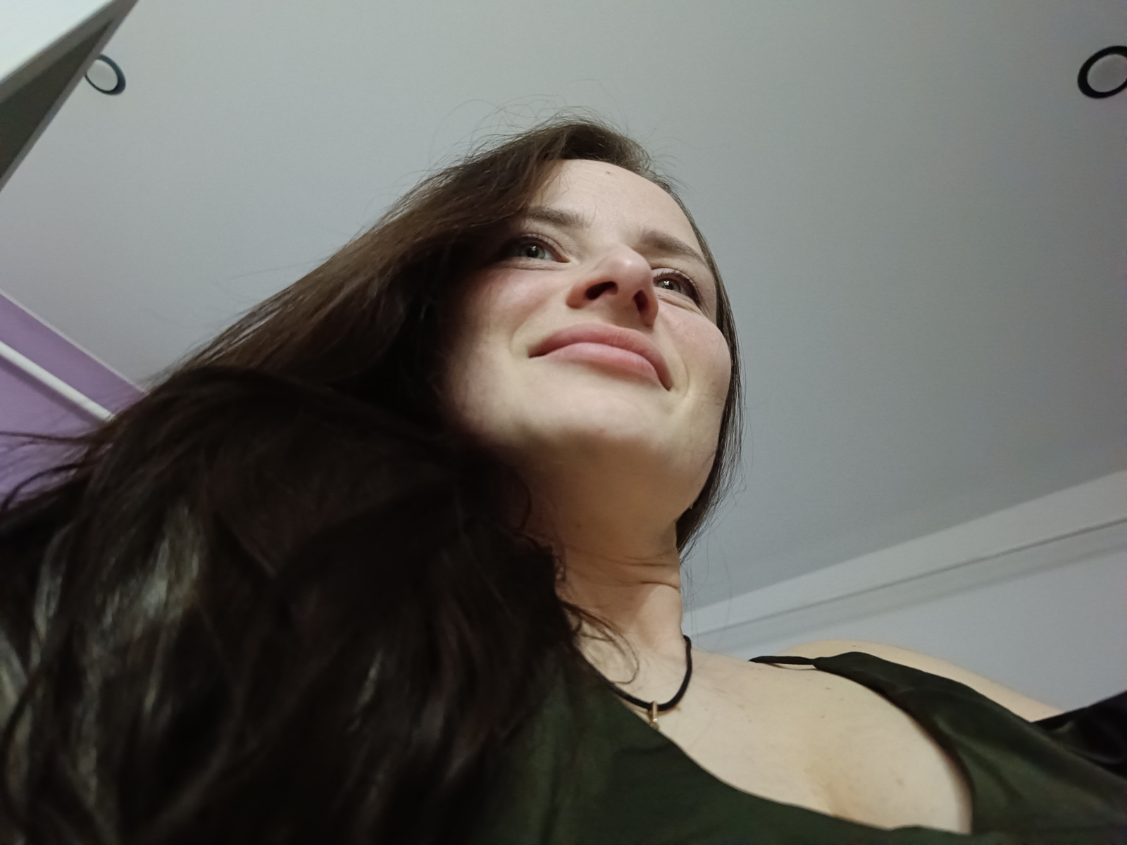 A low-angle shot depicts a woman with long, dark hair looking upwards. She wears a dark green top and a simple black necklace with a small gold pendant. The background consists of a white ceiling withβ¦read more