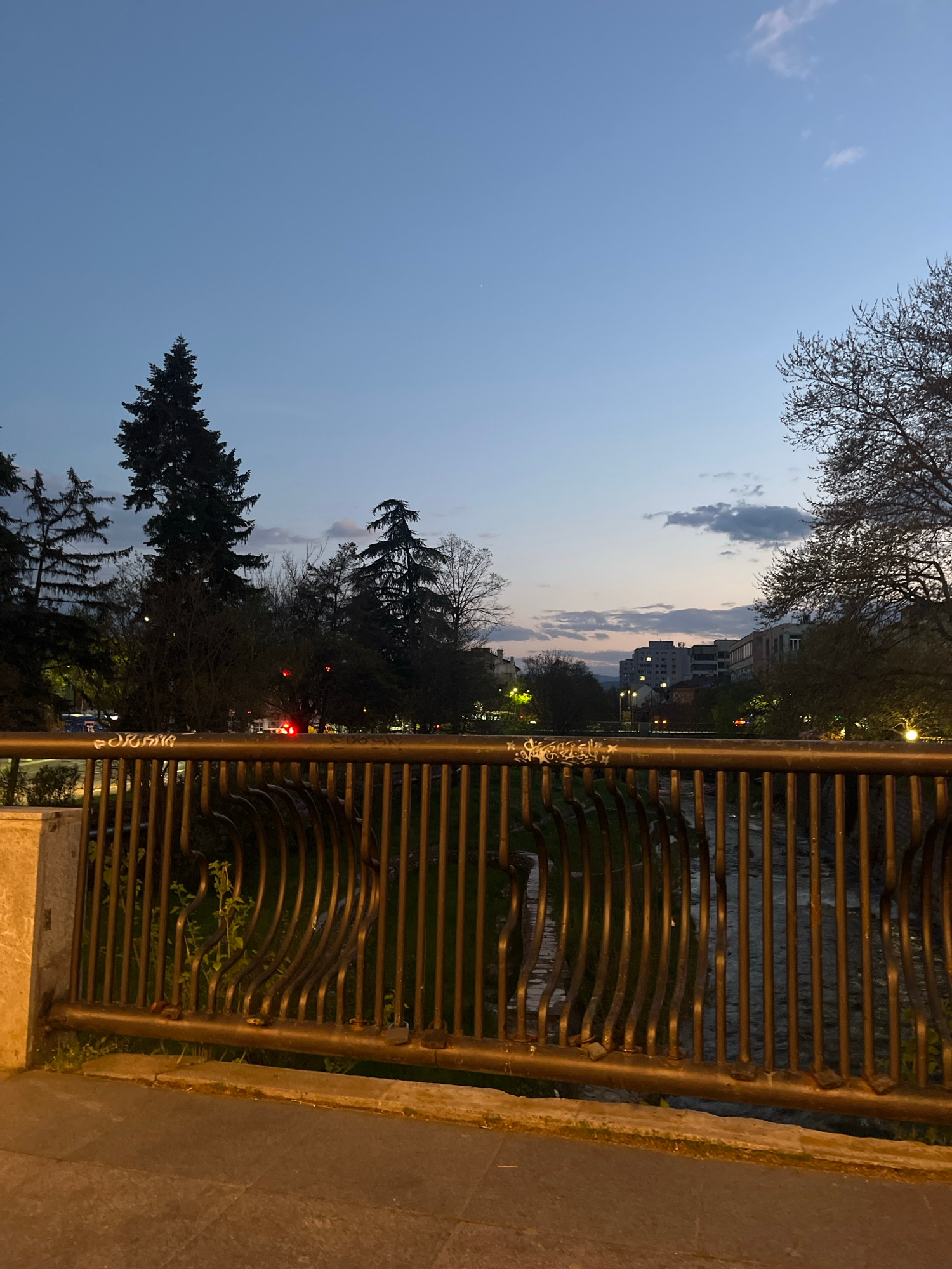 The image is taken from a bridge in Blagoevgrad, Bulgaria, as suggested by the building architecture and local foliage. The foreground consists of a metal fence in a bronze or gold color, displaying a…read more
