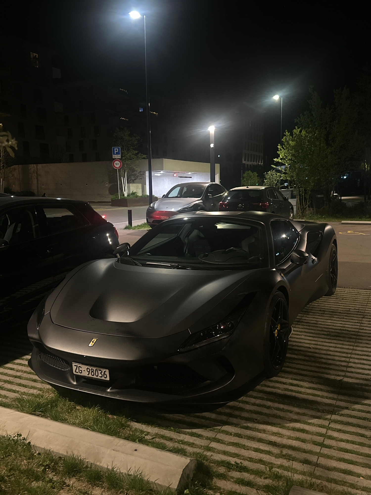 The image captures a nighttime scene in what appears to be a parking area in Dübendorf, Switzerland. The primary subject is a dark, matte-finished sports car, likely a Ferrari, parked on a permeable p…read more