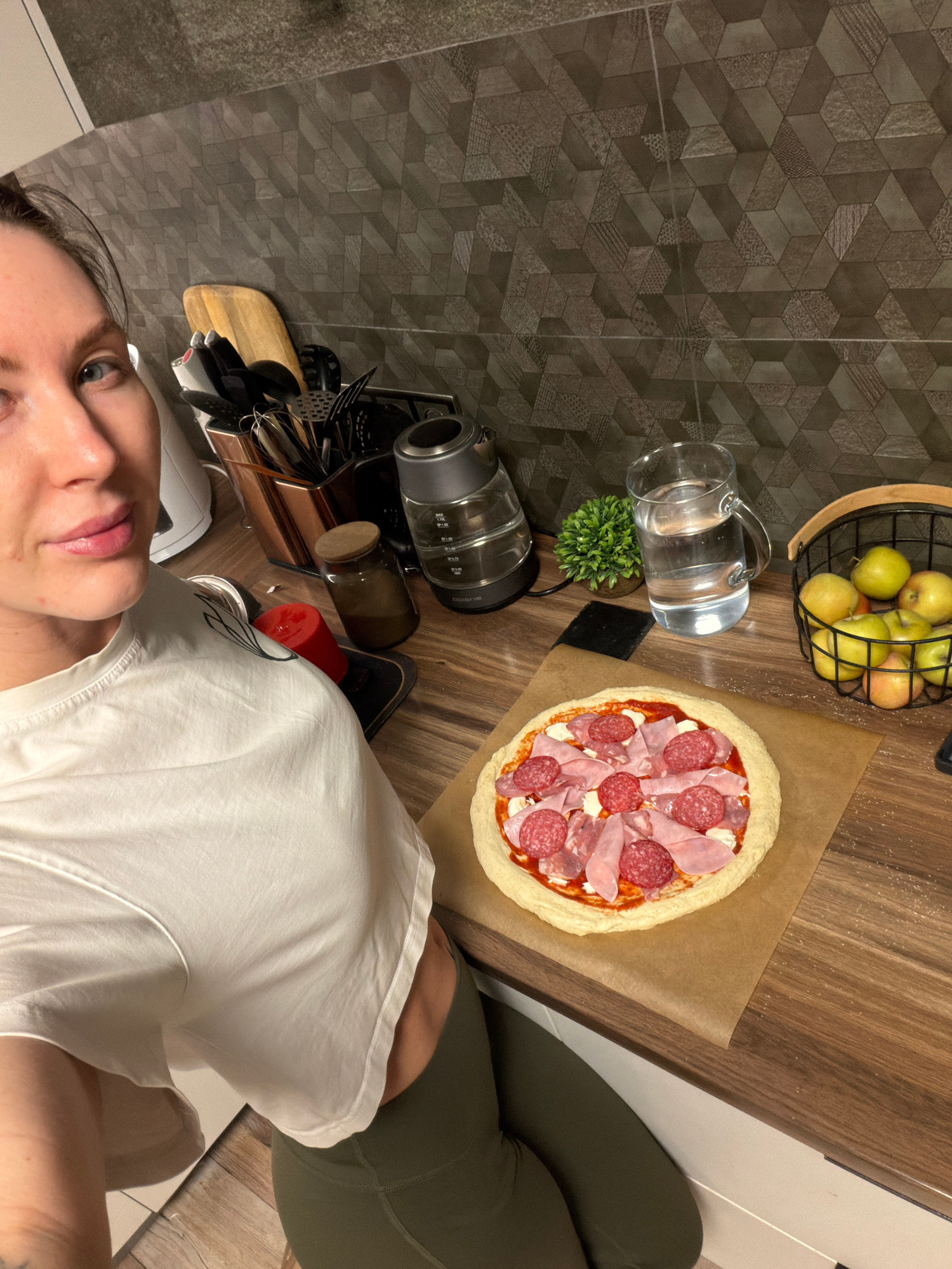 A top-down selfie in what appears to be a kitchen in Perm, Russia, showing a person wearing a white shirt and olive-green leggings. Next to them is a pizza on parchment paper, topped with tomato sauce…read more