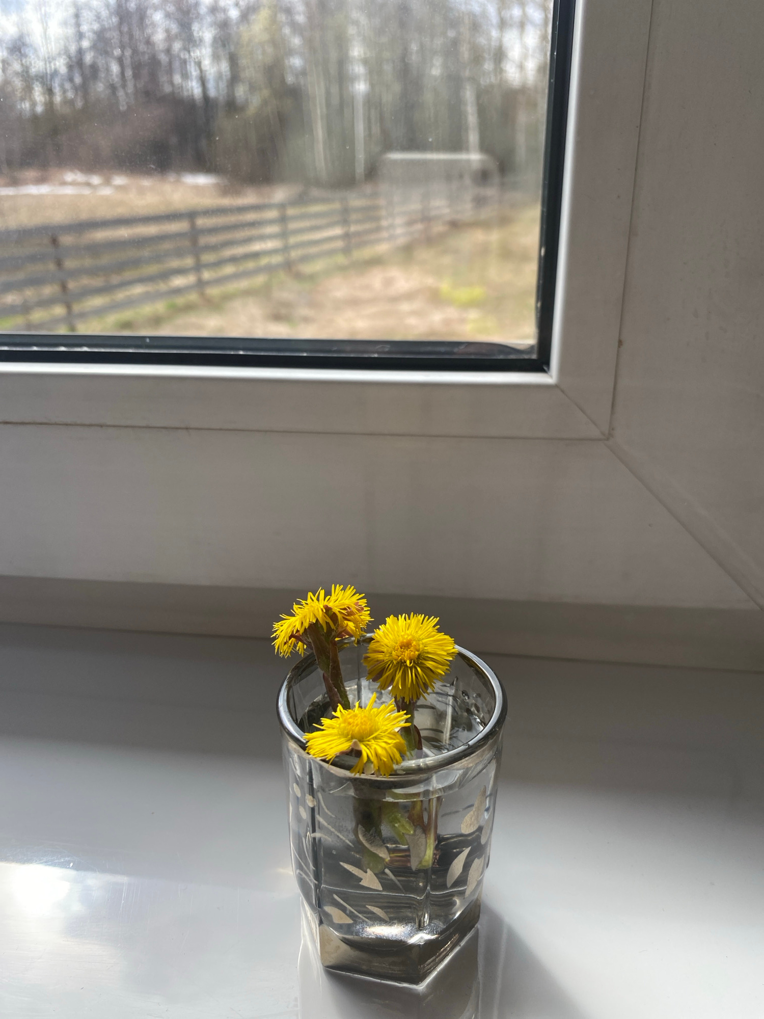A glass vase containing yellow flowers sits on a white windowsill. Outside the window, a blurry view of a rural landscape with bare trees and what appears to be a wooden fence is visible. The location…read more