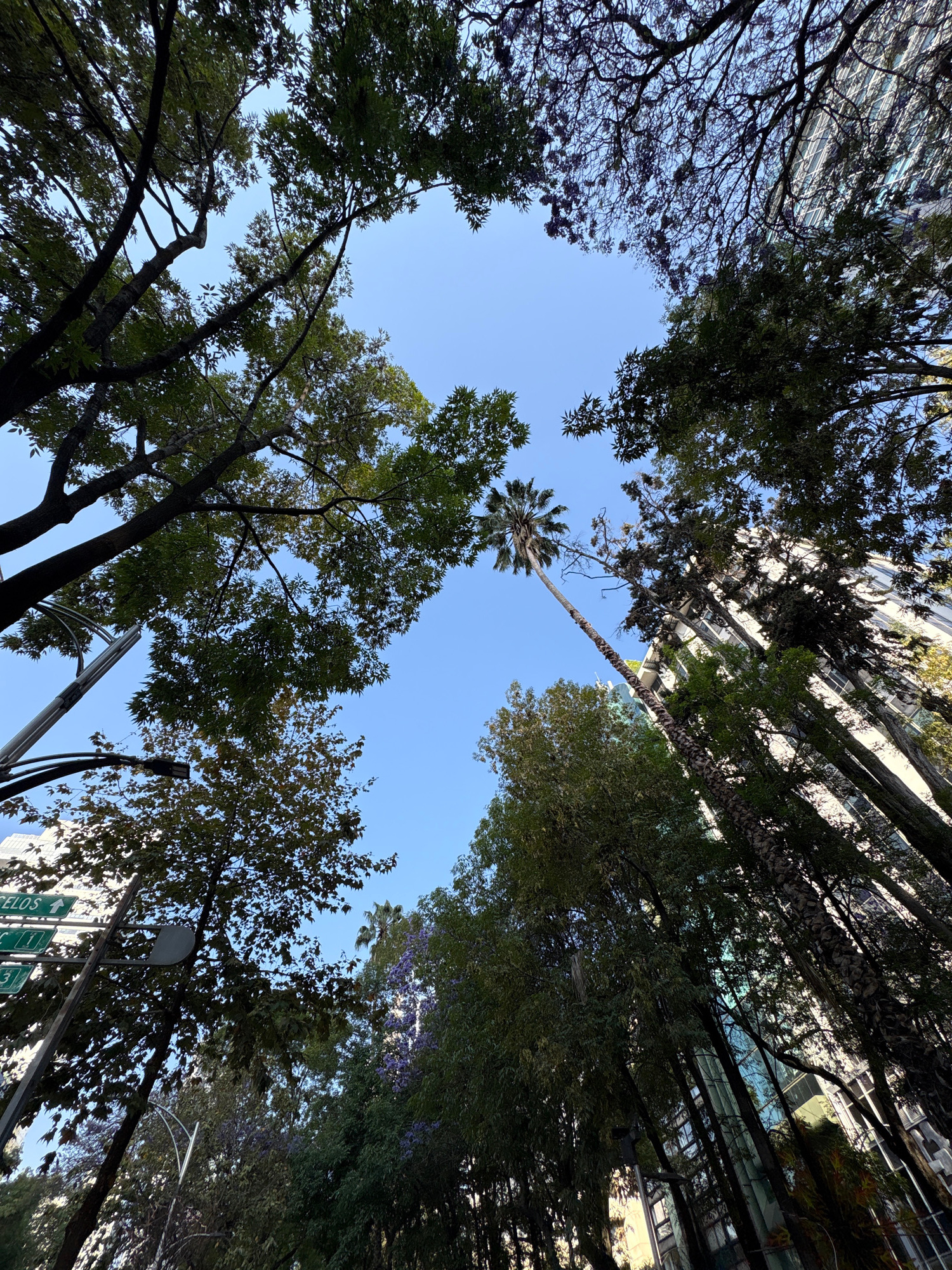 An upward-angled photograph captures a clear blue sky framed by dense tree canopies and portions of urban architecture. The central element is a bright, cloudless sky. Surrounding this central void, v…read more