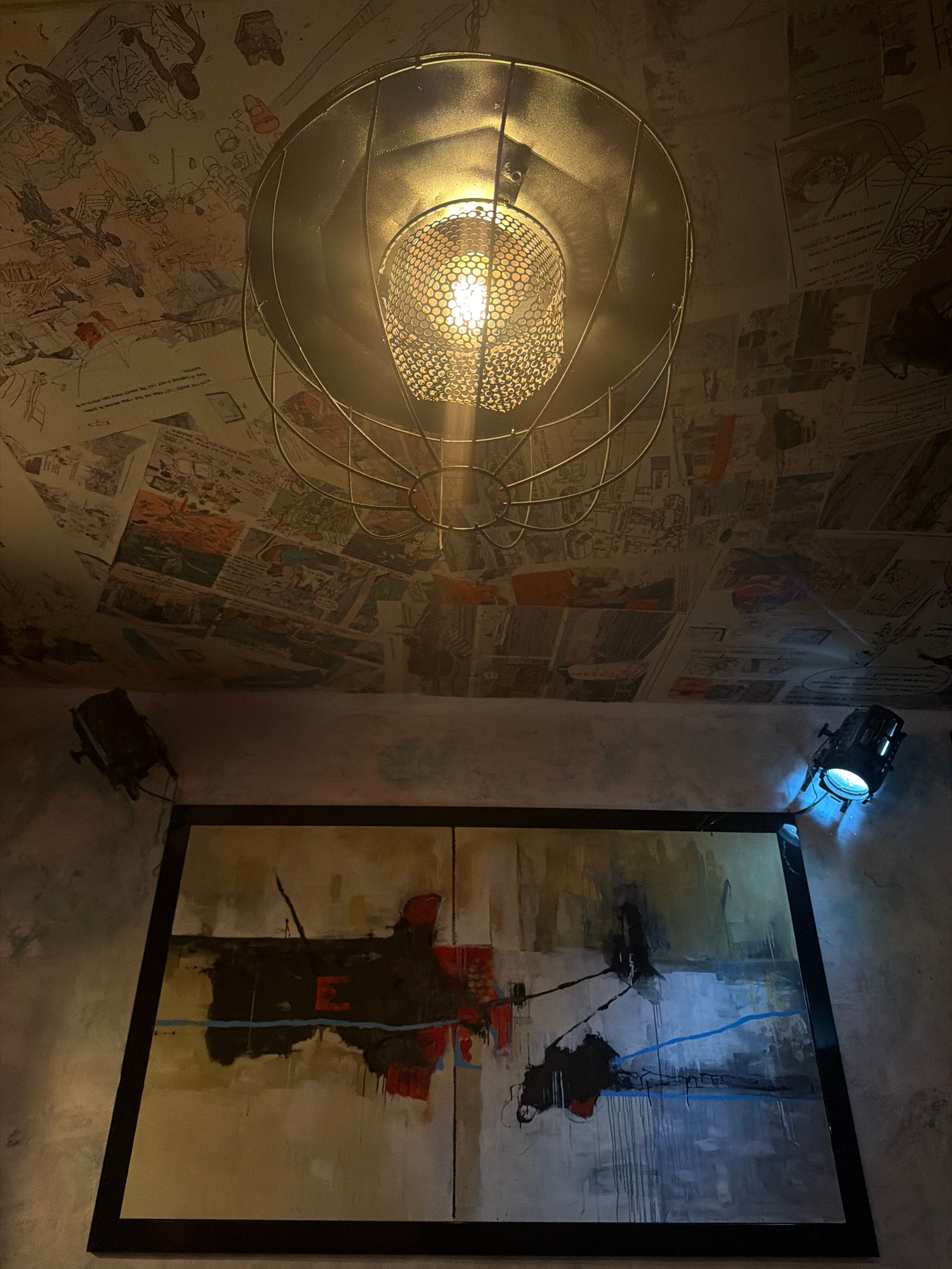 The image captures an interior corner in what appears to be a room in Podgorica, Montenegro. The left wall is covered with collage-style wallpaper featuring illustrations, possibly comic strips or new…read more