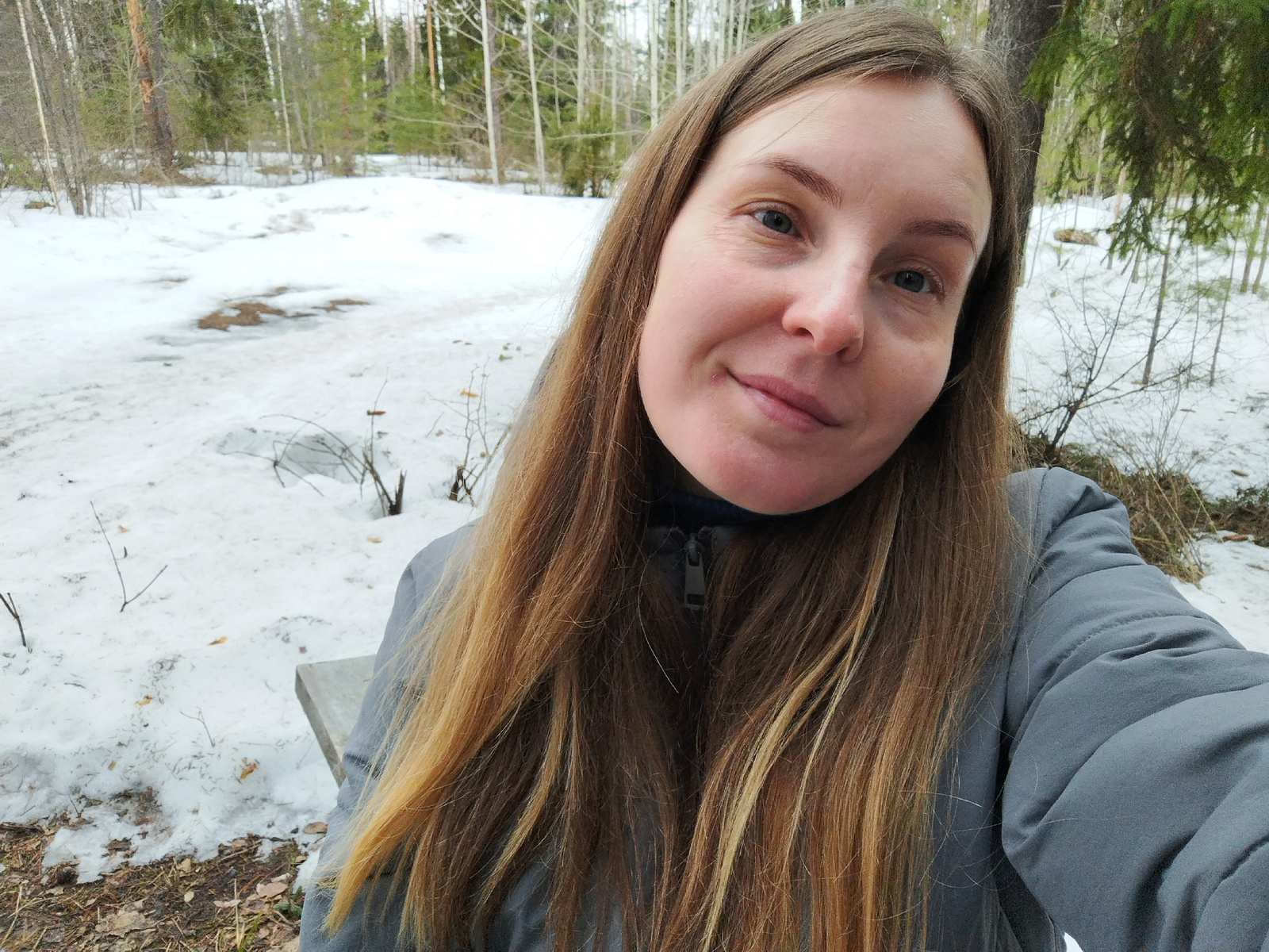 The image depicts a woman in a gray jacket, likely taking a selfie. Her hair is long and brown, with lighter ends. The background shows a snow-covered area with trees, including birch. The location is…read more