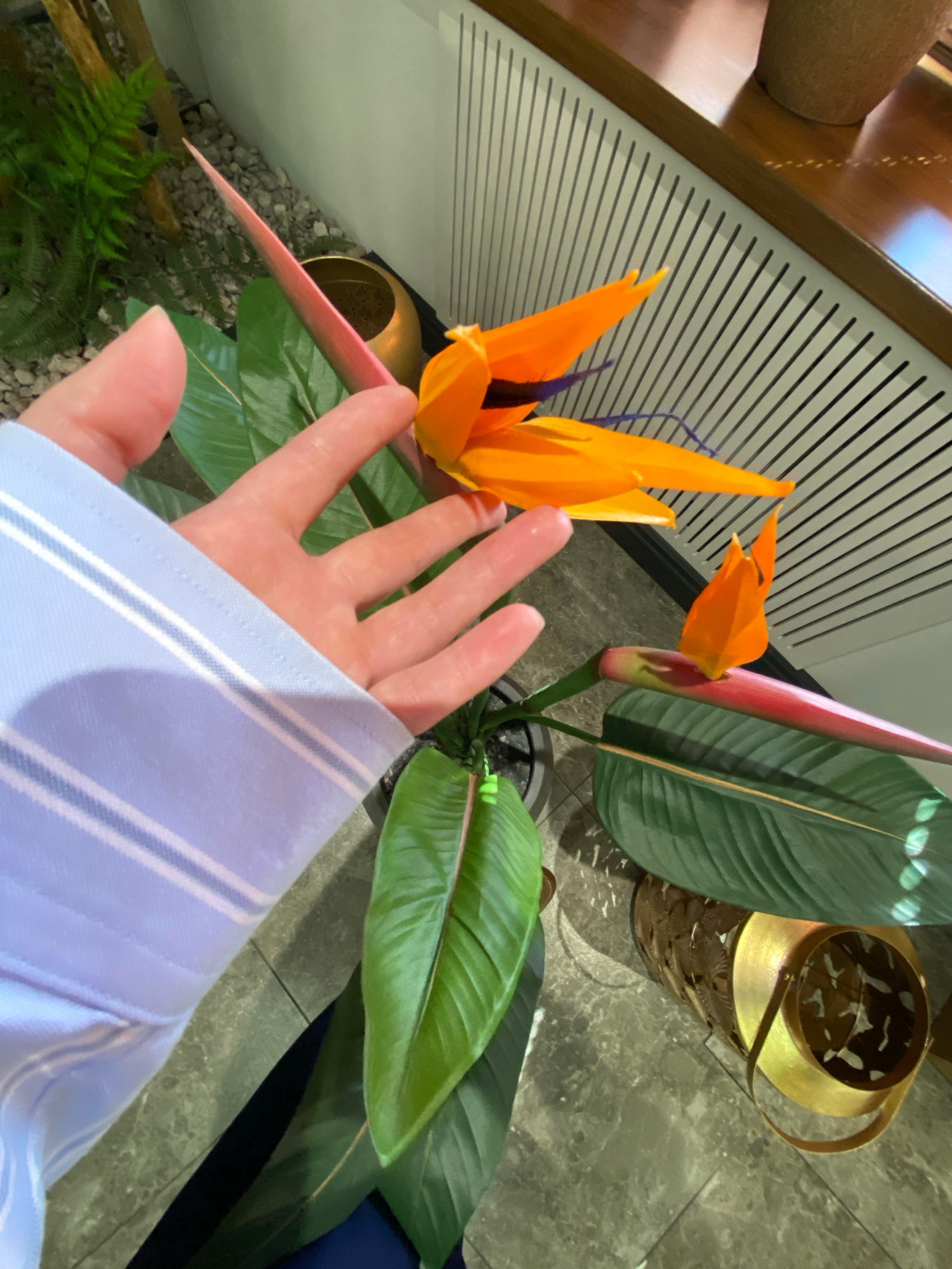 An indoor scene in Votkinsk, Russia, captured from a slightly elevated perspective, features a person's hand reaching towards a vibrant arrangement of Bird of Paradise flowers. The fair-skinned hand,…read more