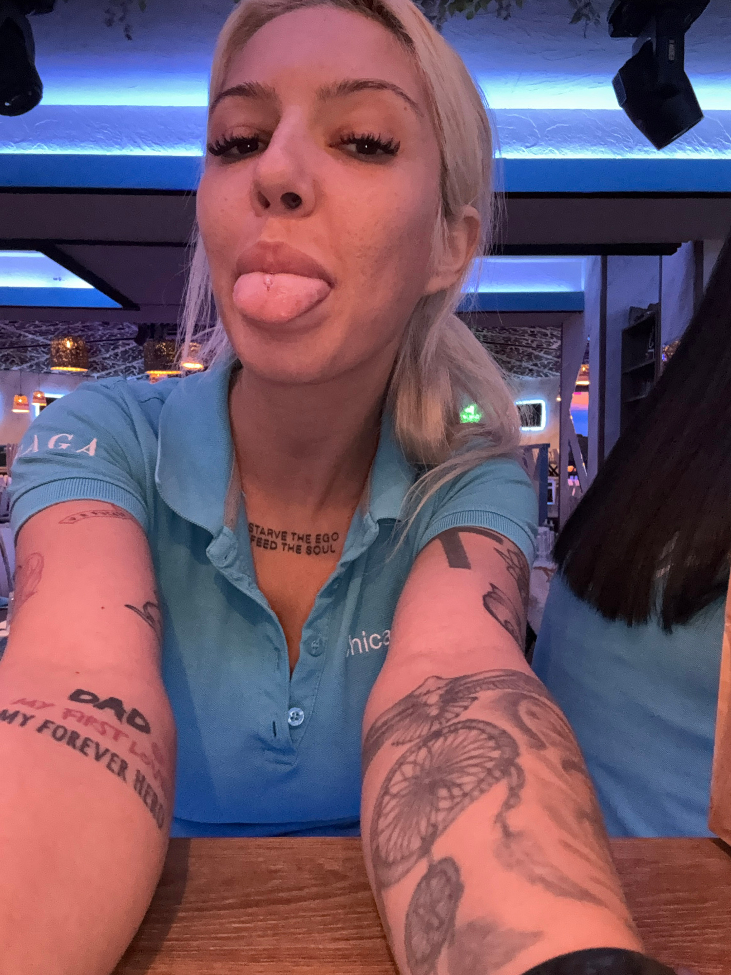 A close-up selfie captures a blonde woman with a playful expression, sticking her tongue out. She has dark eyes, prominent eyelashes, and a small nose piercing. Her long blonde hair is swept back, and…read more