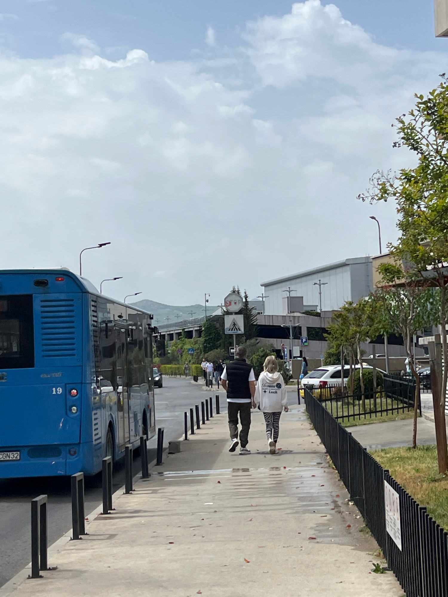 A bright blue bus, parked on a sunny, concrete surface with metal guard posts along its side, occupies the foreground. In the distance, two people walk along the sidewalk, and beyond them lies a moder…read more