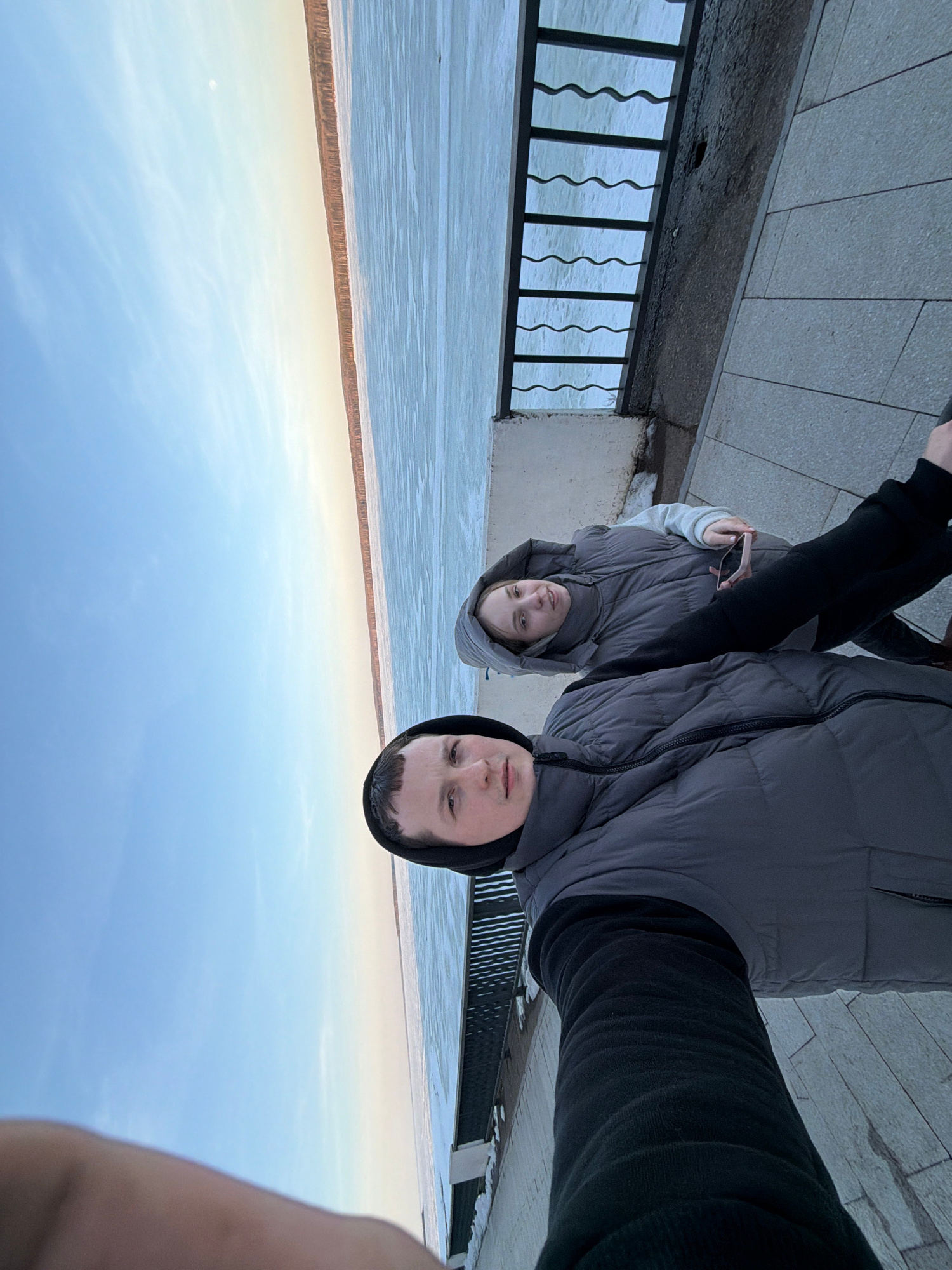 Two individuals are positioned in front of what appears to be a partially frozen body of water. The image is taken from an unusual, almost upside-down angle. One person is wearing a dark hoodie and a…read more