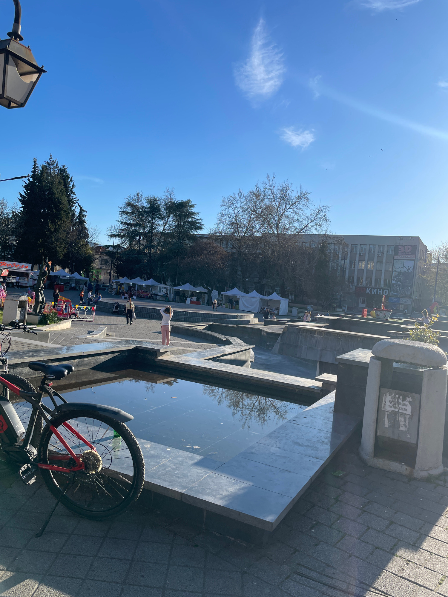 The image captures a sunny scene in Pazardzhik, Bulgaria. It shows a paved public space, likely a square or plaza. In the foreground, a bicycle leans against a dark, possibly marble, structure that ap…read more