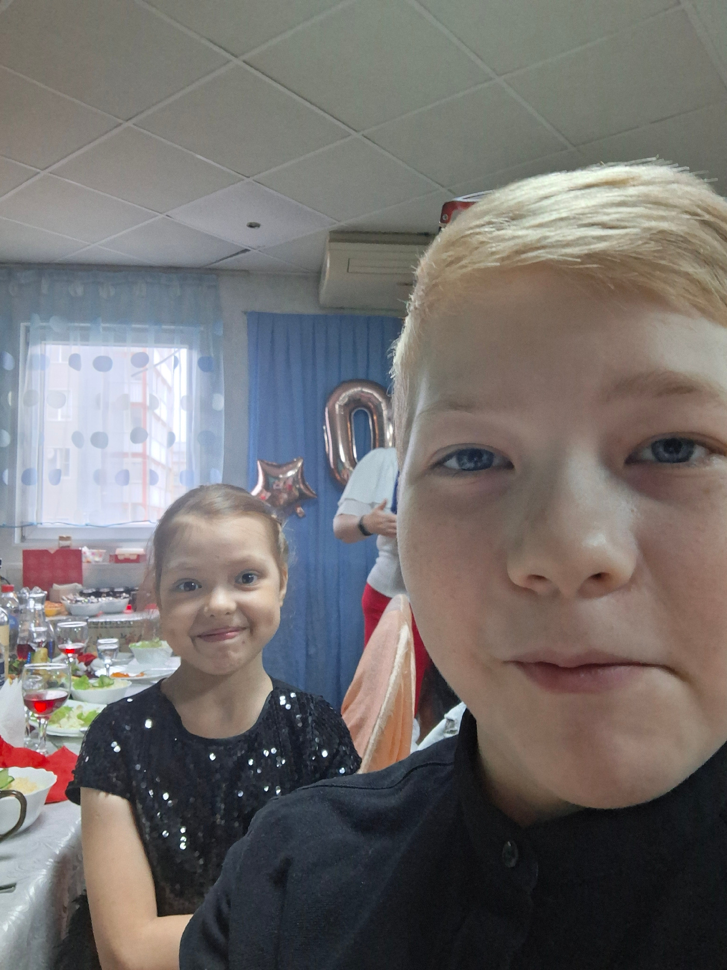 Two children, likely siblings, pose for a selfie in a room decorated for a birthday party, potentially located in Chaikovsky, Russia. The elder child, a blond boy, is in the foreground, wearing a blac…read more