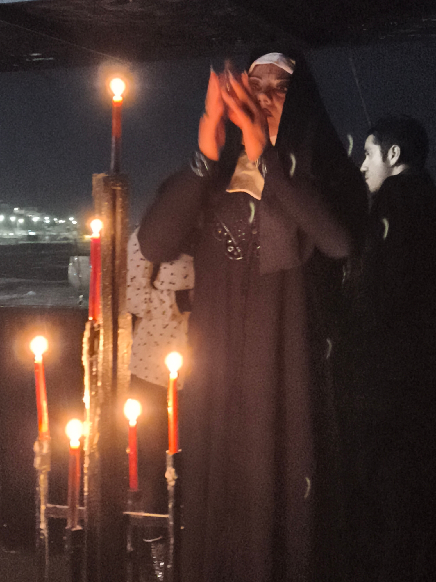 The image captures a scene with a person dressed as a nun standing beside a makeshift altar of lit candles. The person, with hands raised and palms facing each other, is positioned near a man in dark…read more