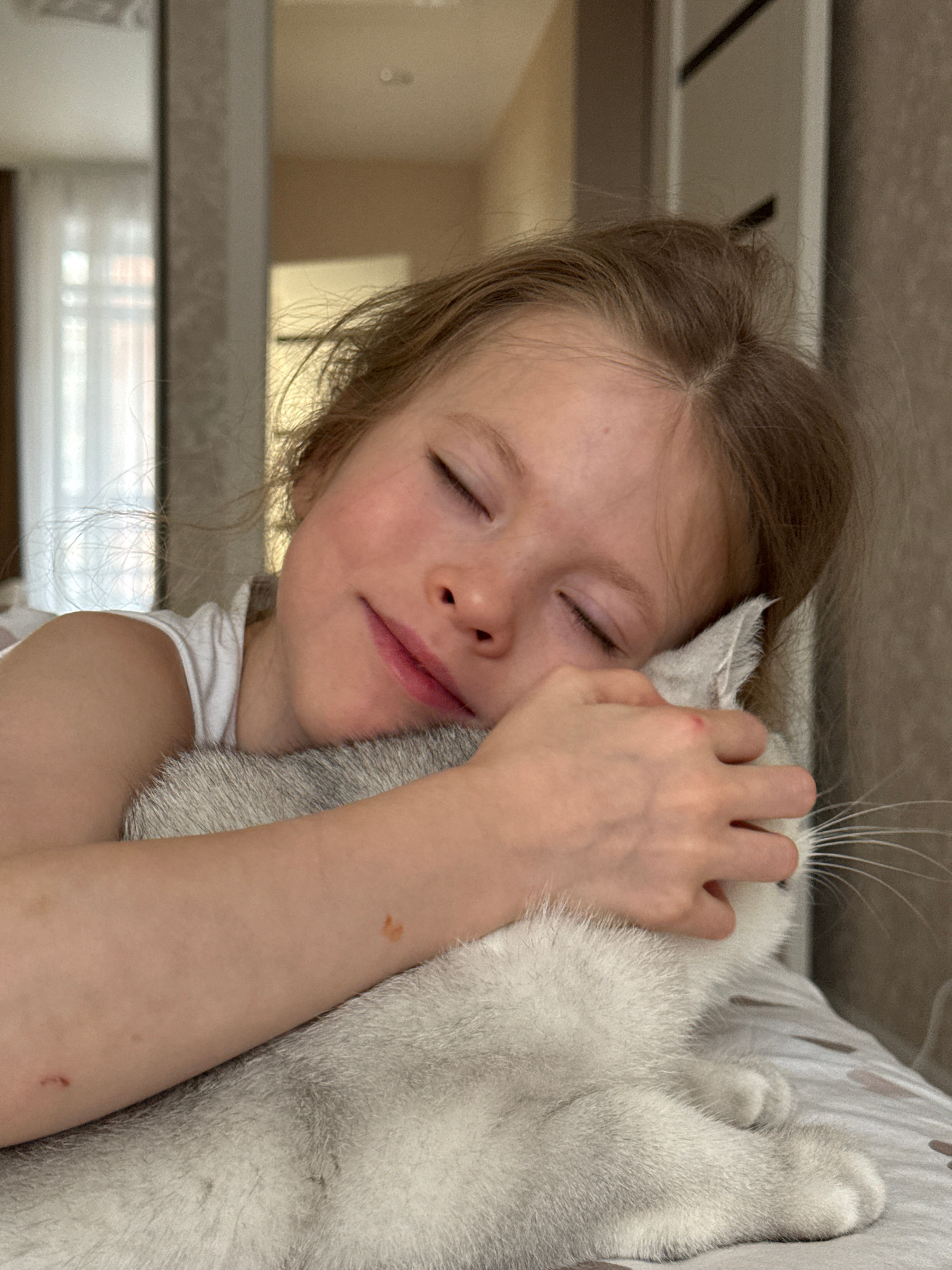 A young girl with blonde hair pulled back is hugging a white cat. The girl has her eyes closed and appears content. Her arm is around the cat, and her hand is touching the cat's head. The background s…read more