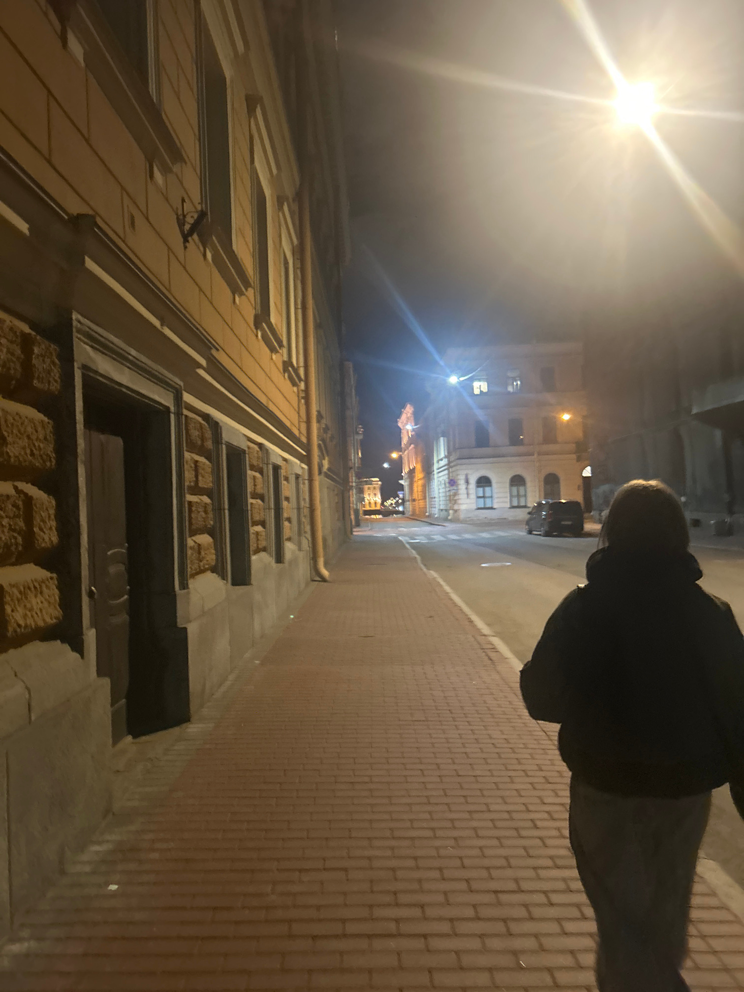 This night-time image, captured in what is identified as Saint Petersburg, Russia, depicts a person walking down a city street. The perspective is from slightly behind and to the left of the individua…read more