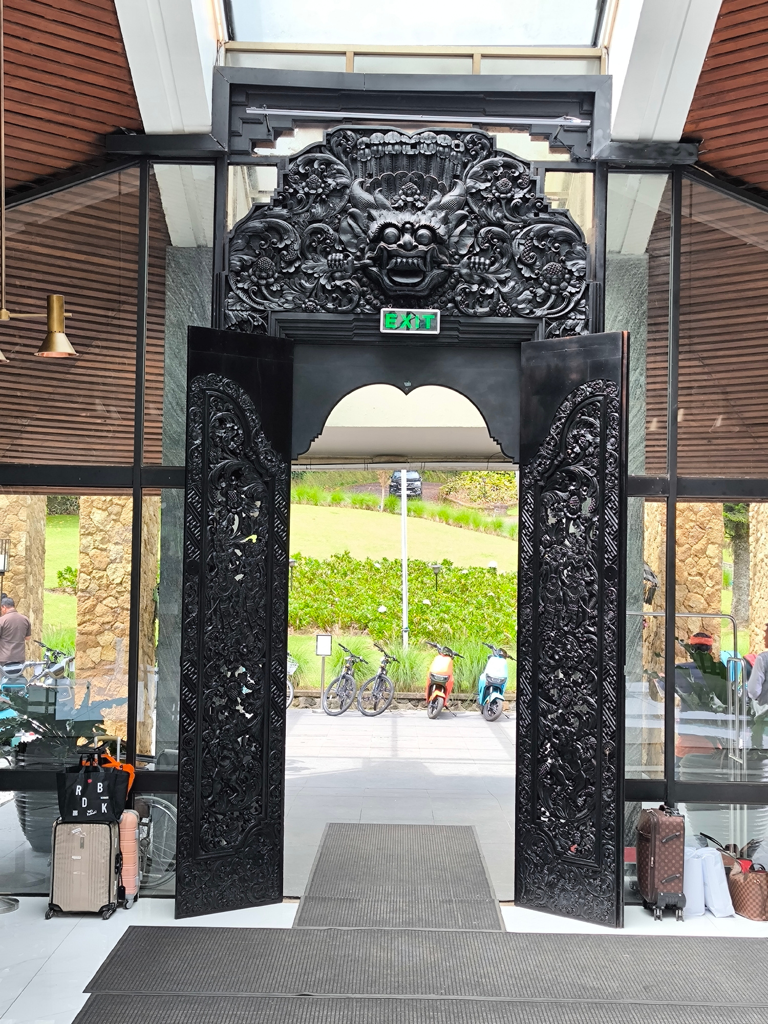 The image captures an entrance at a location in Wanagiri, Indonesia. A large, ornate, black wooden doorway stands open, revealing a view of a green lawn with several bicycles and scooters parked outsi…read more