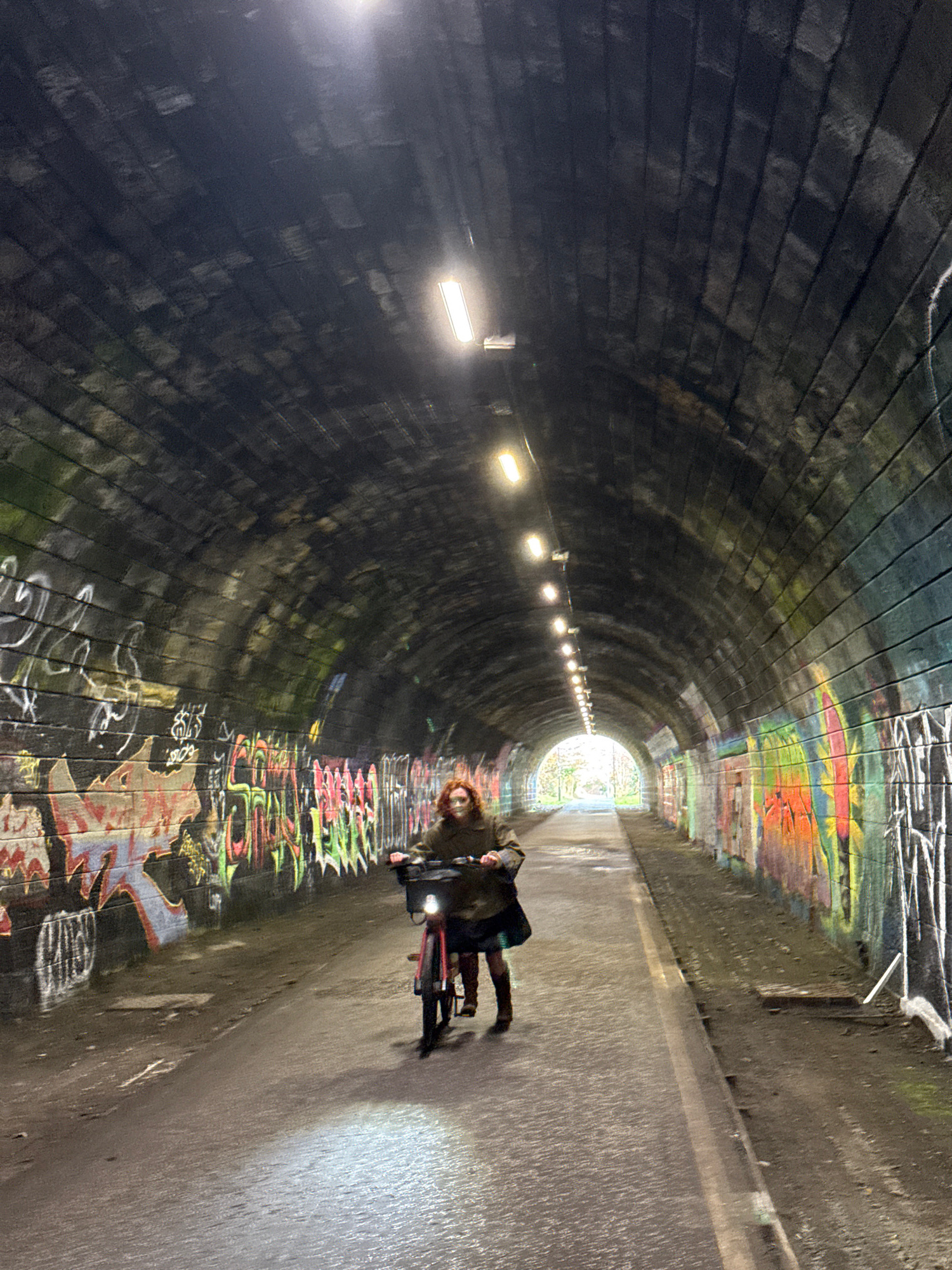 A long, arched tunnel with brick walls receding into the distance with graffiti along its length is illuminated by overhead lights. A person is riding a bicycle toward the end of the tunnel where ligh…read more