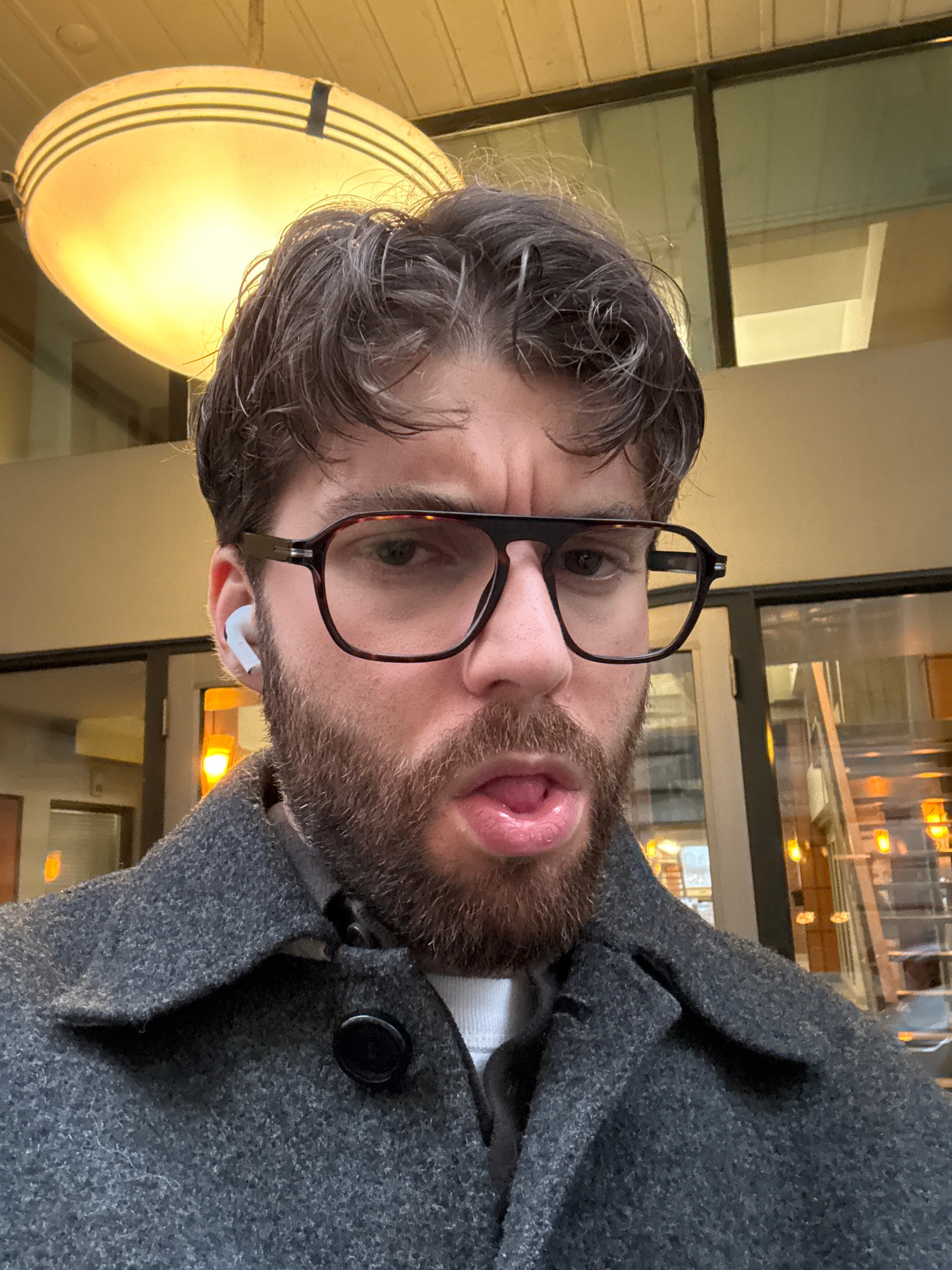 A close-up, rotated selfie features a man making a playful expression by sticking out his tongue. The image is oriented 90 degrees clockwise. The man has a dark, slightly messy beard and dark hair witβ¦read more