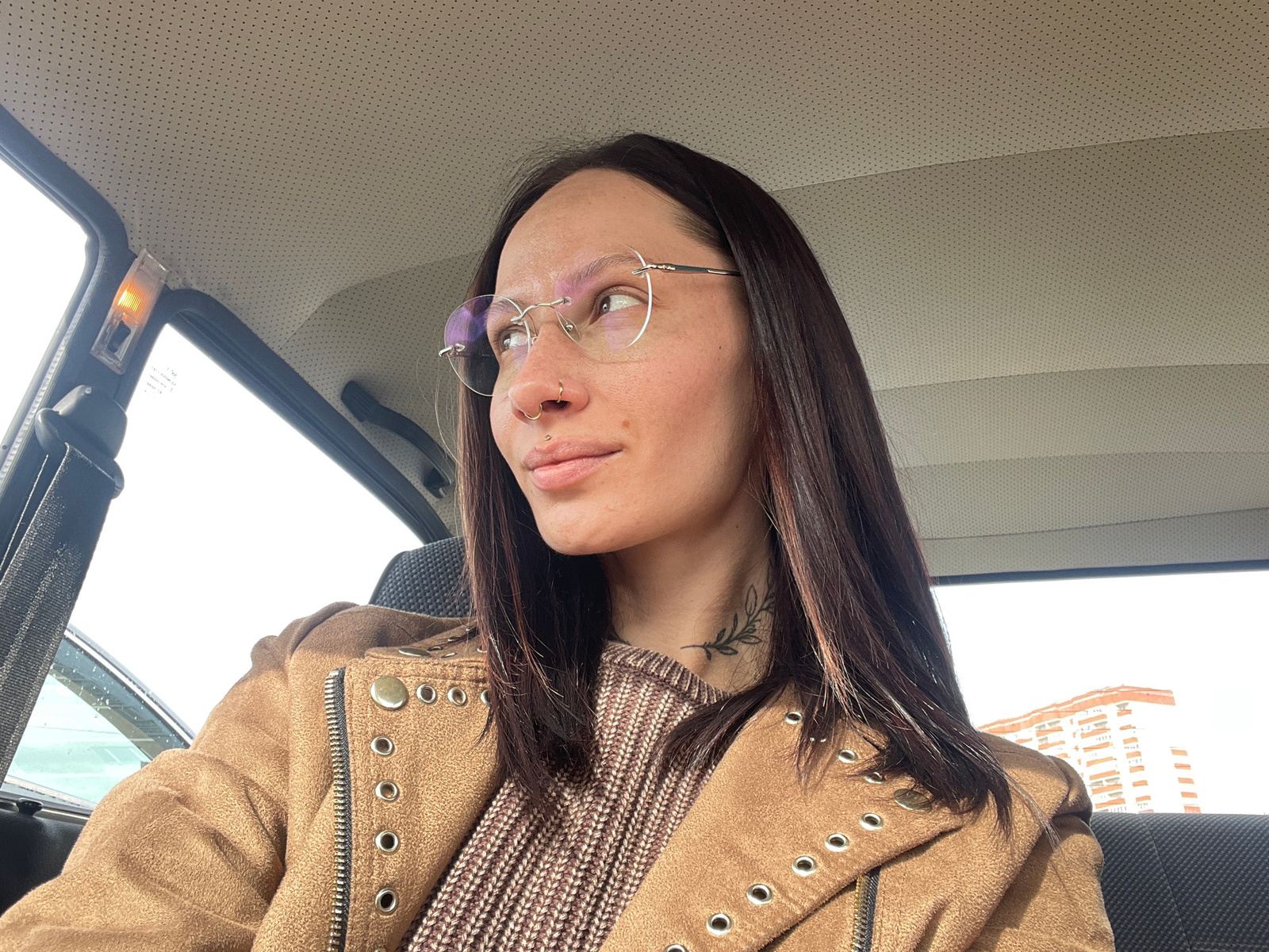 A woman with light skin, brown hair, and glasses is photographed inside a car. She has multiple facial piercings on her nose and is wearing a brown jacket over a brown sweater. A tattoo is visible onβ¦read more
