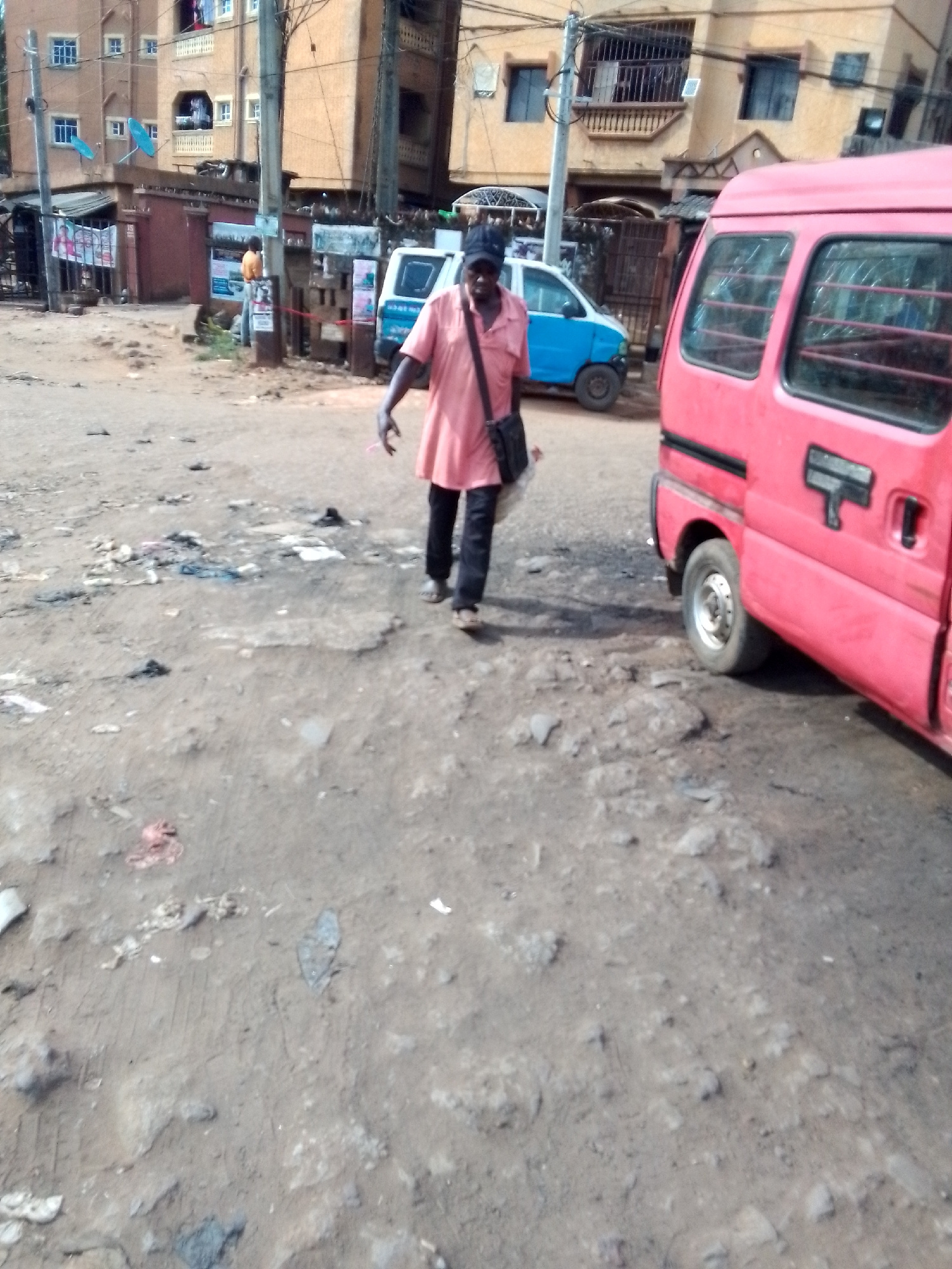 The image depicts a street scene in Onitsha, Nigeria, characterized by a deteriorated, unpaved road littered with debris. A man wearing a pink shirt, dark pants, and a black cap walks across the road,…read more