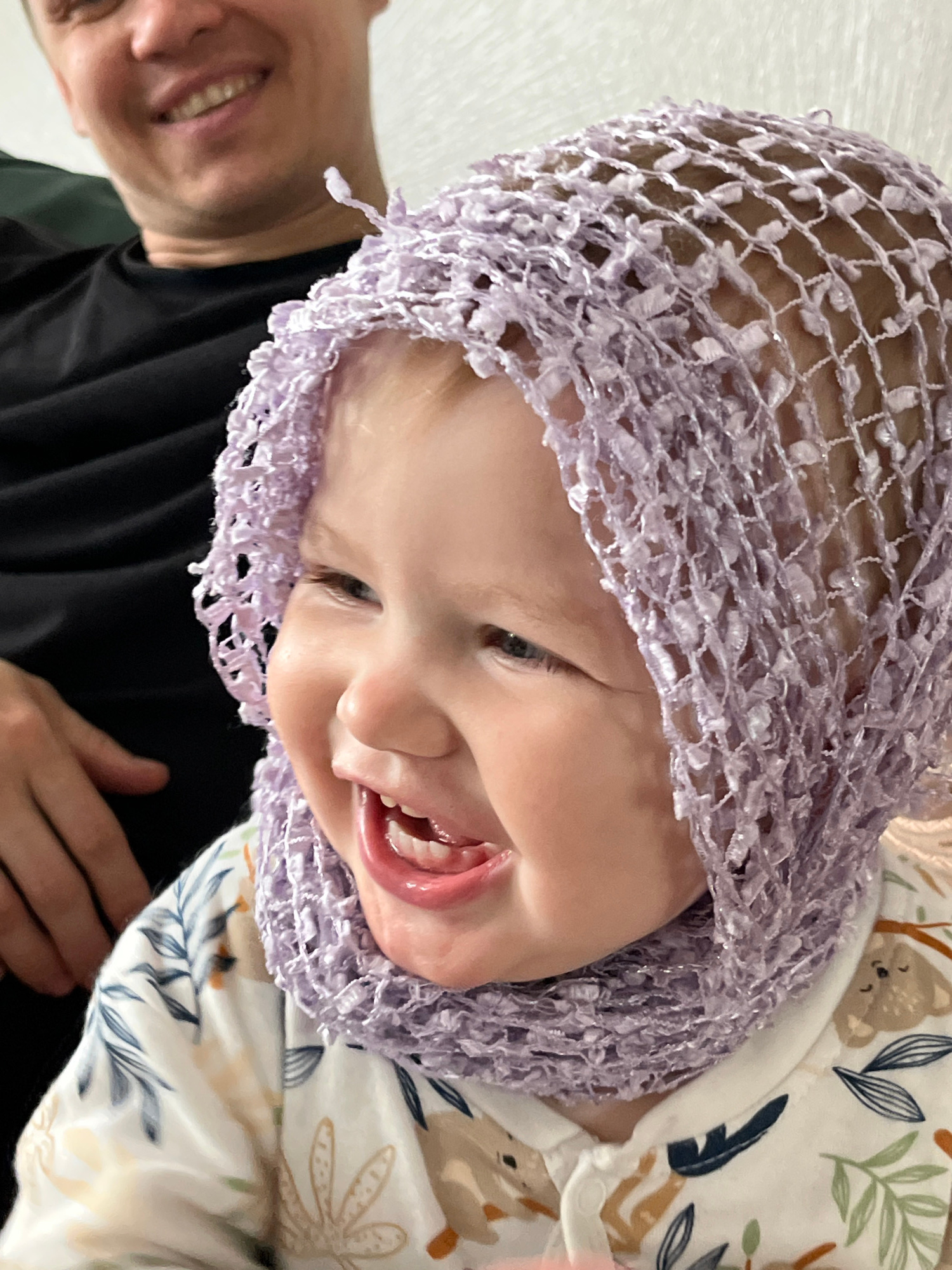 The image shows a close-up, tilted view of a baby with a light purple crocheted bonnet. The baby is smiling, revealing some teeth. The baby is wearing a light-colored garment with a print of koalas an…read more