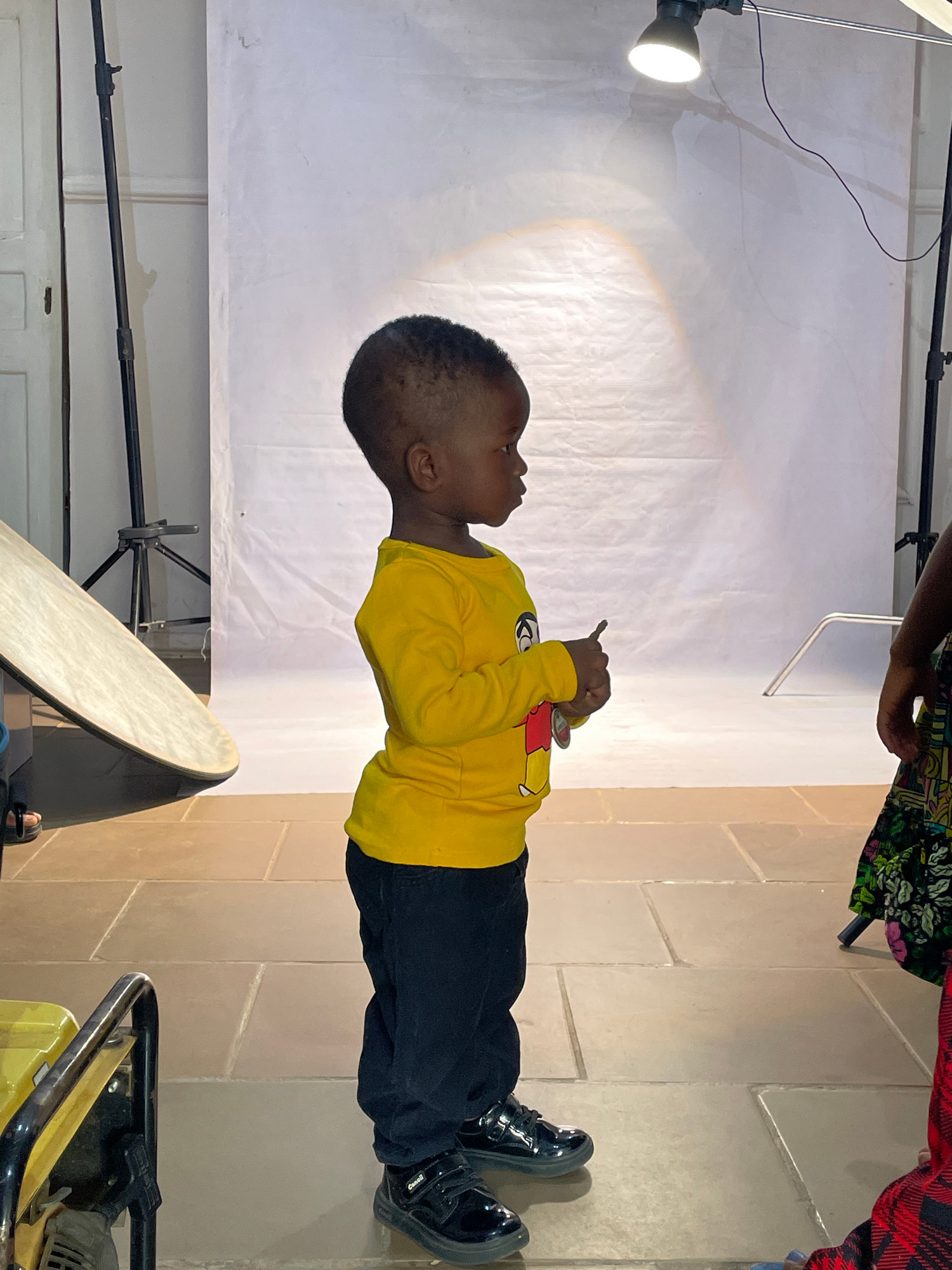 A young Black child stands facing left in an indoor setting, likely a photography studio. The child wears a bright yellow long-sleeved shirt with a red and white cartoon emblem on the chest, black tro…read more