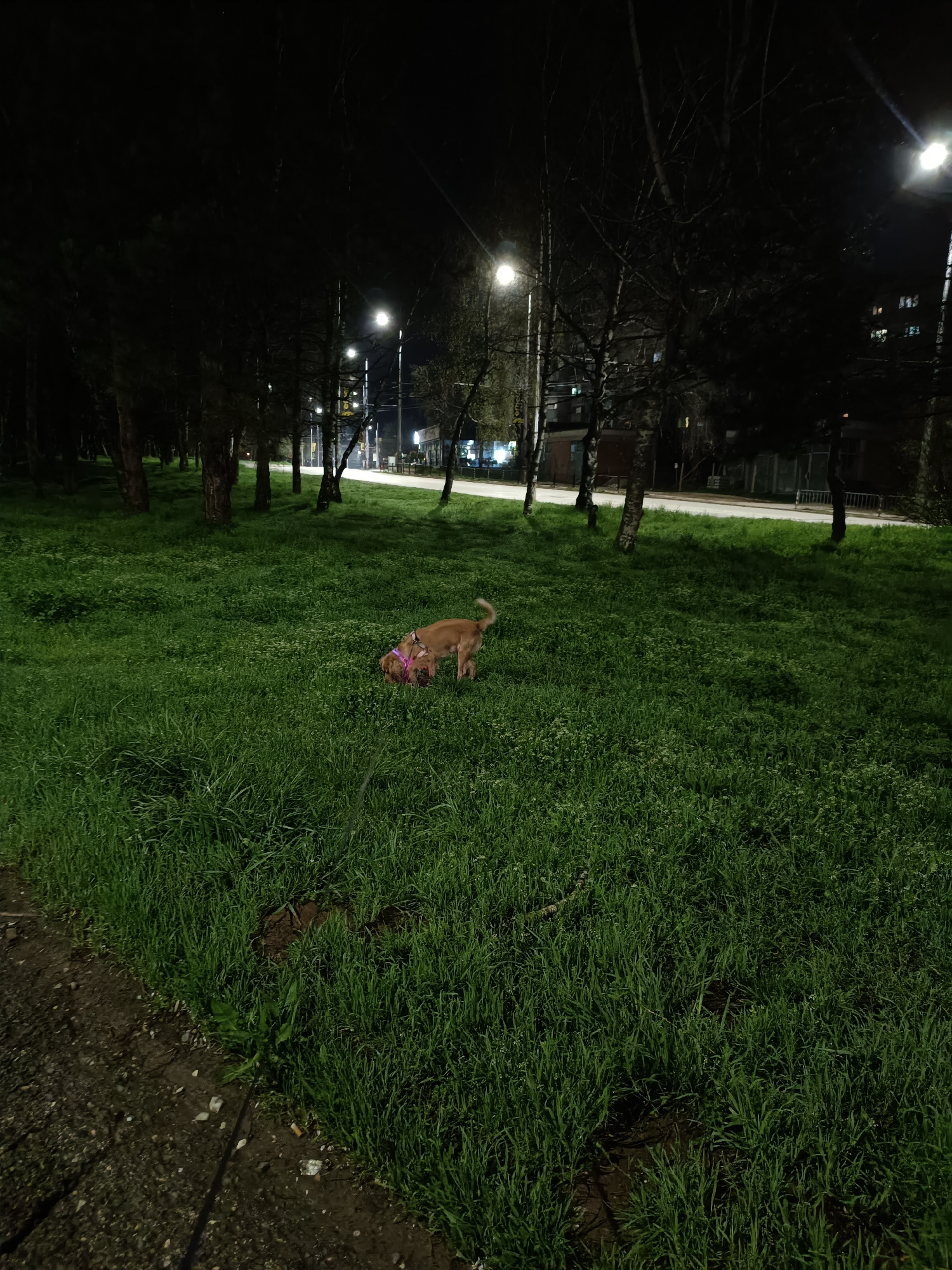 A medium-sized, short-haired, tan dog is in the middle of a grassy area. The dog is wearing a pink collar. The area is a park or green space at night with street lights illuminating the scene. There a…read more