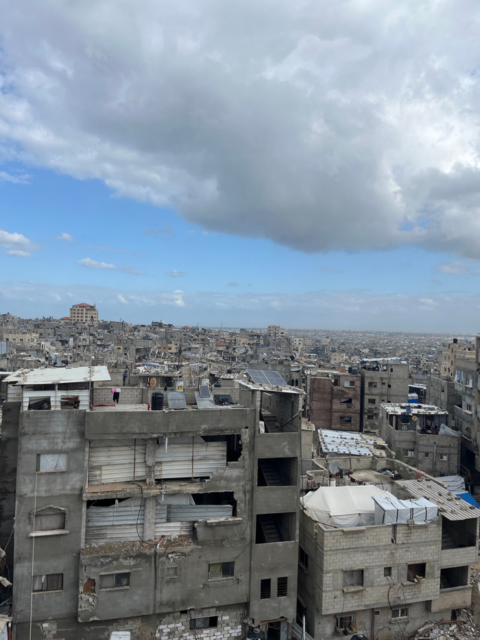 An aerial view of the city of Khan Yunis, Palestinian Territory, reveals a densely built urban environment under a partly cloudy sky. The scene is dominated by multi-story concrete buildings, many exh…read more