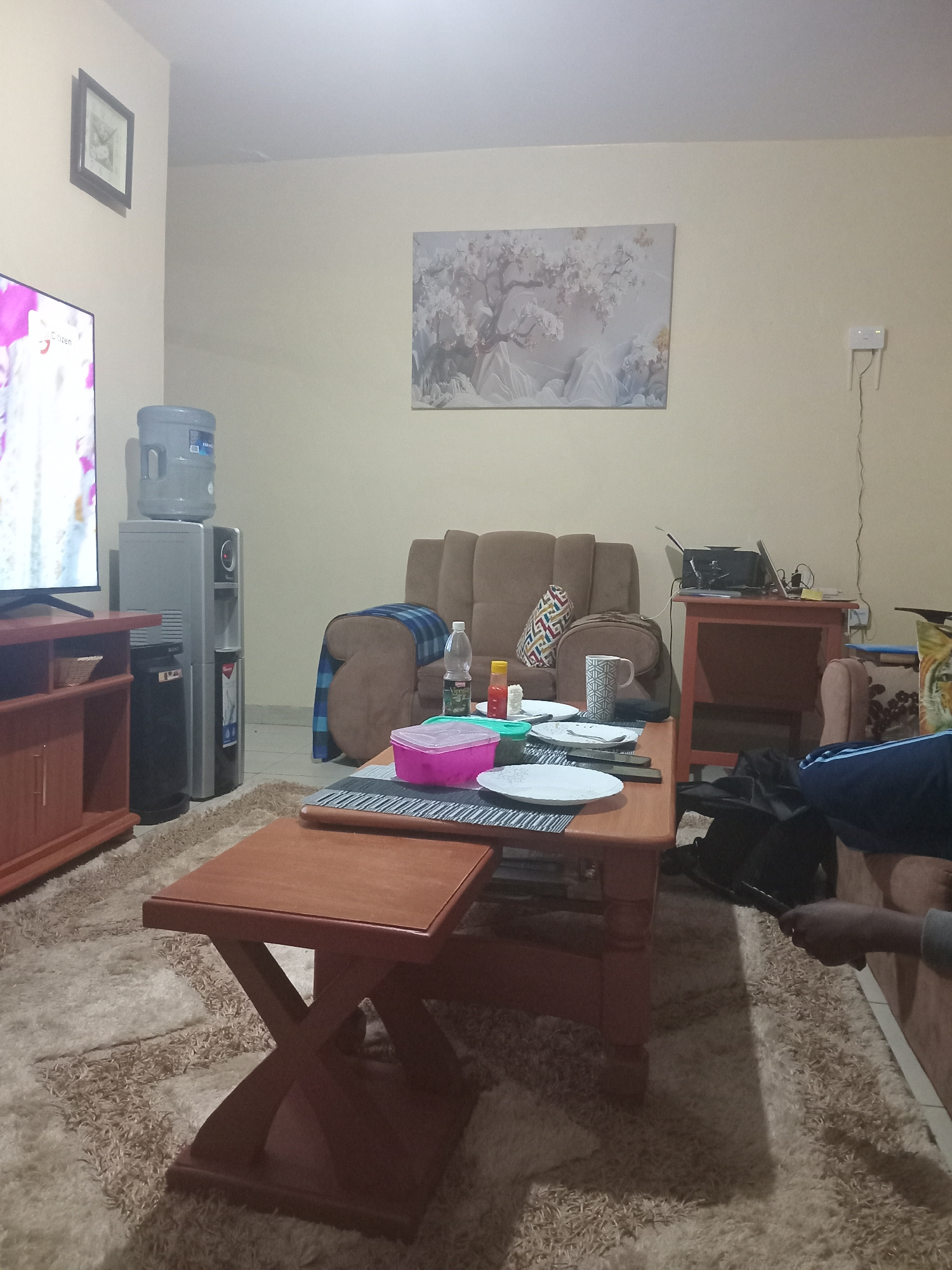 The image depicts an interior scene, likely a living room, in what appears to be a home in Kakamega, Kenya. The room contains a brown reclining sofa with a patterned cushion and a blue and white throw…read more