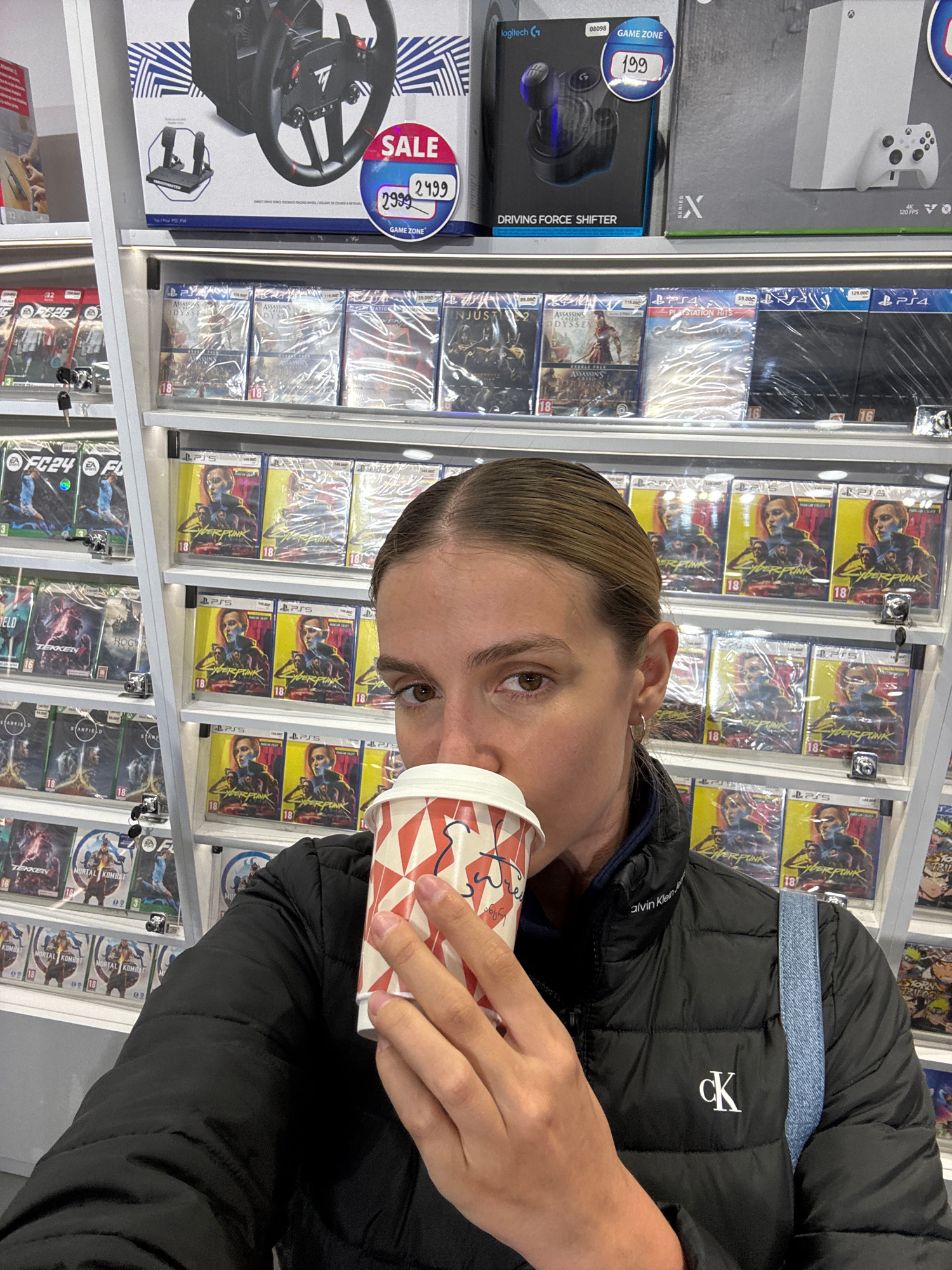A person in a black Calvin Klein puffer jacket is seen holding a disposable cup. The background is a retail setting, with shelves stocked with video games, including "Cyberpunk 2077", "FC24", "Hogwart…read more