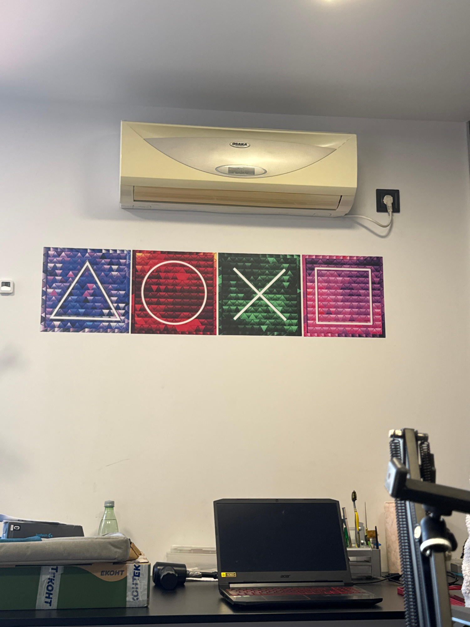 The image shows a section of a wall in an indoor environment. On the left, a white air conditioning unit is mounted on the wall, with a power outlet and plug visible above it. Adjacent to the right ofโฆread more
