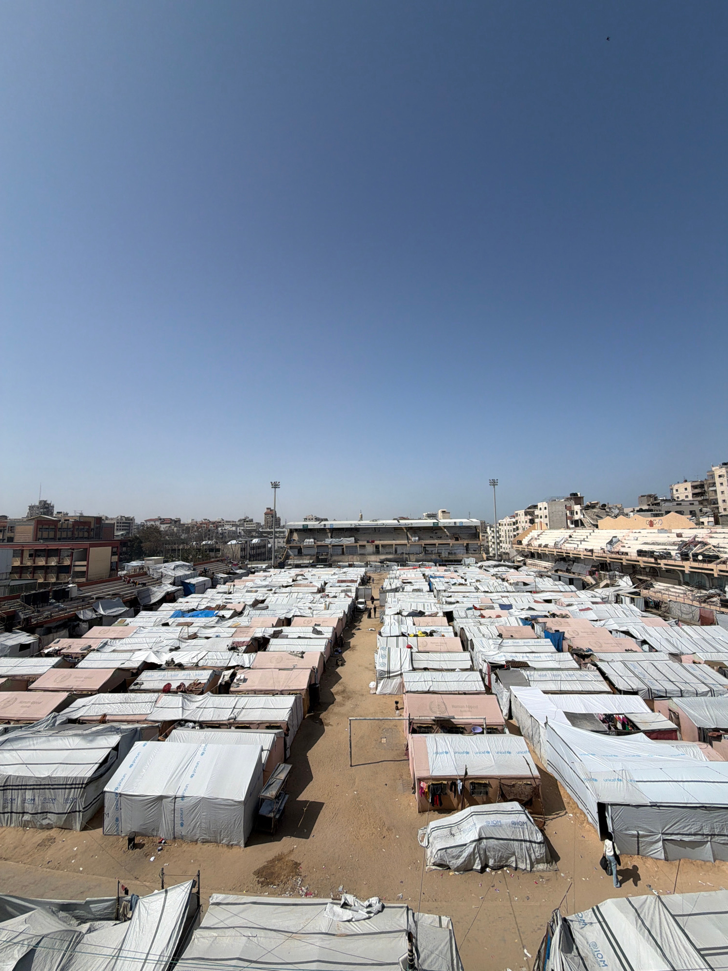 The image, oriented correctly, depicts a vast, densely packed encampment of temporary shelters under a clear, bright blue sky. The shelters, predominantly rectangular structures covered with white or…read more